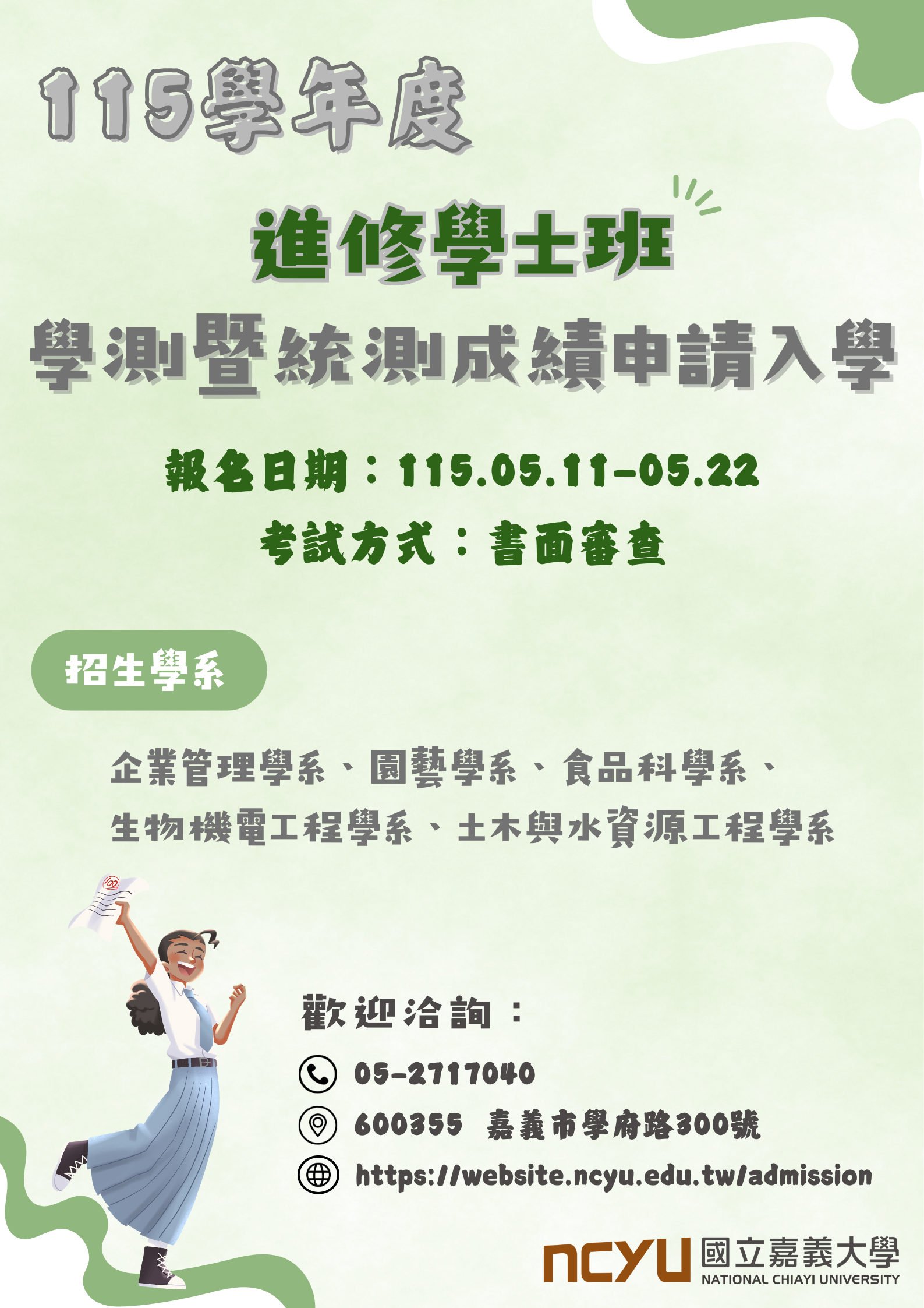 | 2026/01/14 | 115學年度進修學士班學測暨統測成績申請入學海報 | 招生與出版組 | |