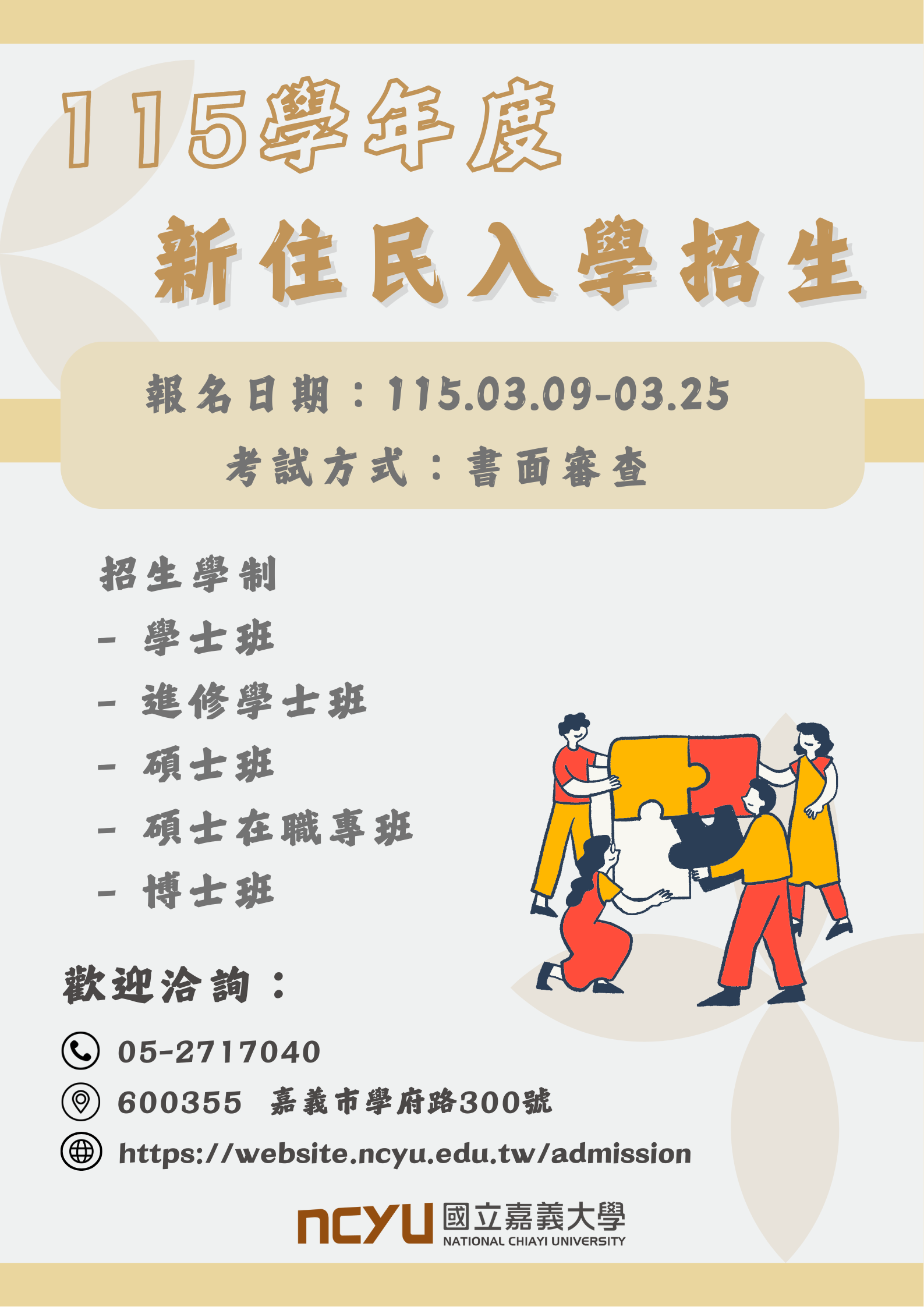 | 2026/01/14 | 115學年度新住民入學招生海報 | 招生與出版組 | |
