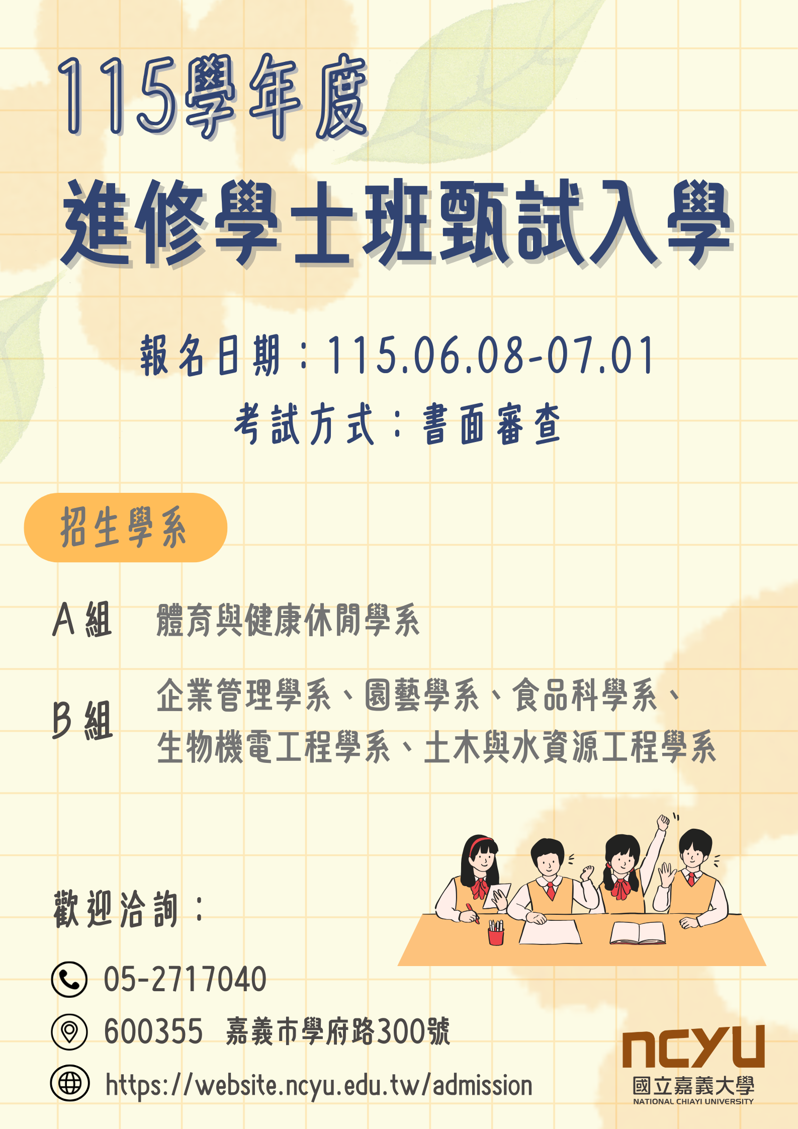 | 2026/01/08 | 115學年度農場管理進修學士學位學程海報 | 招生與出版組 | |