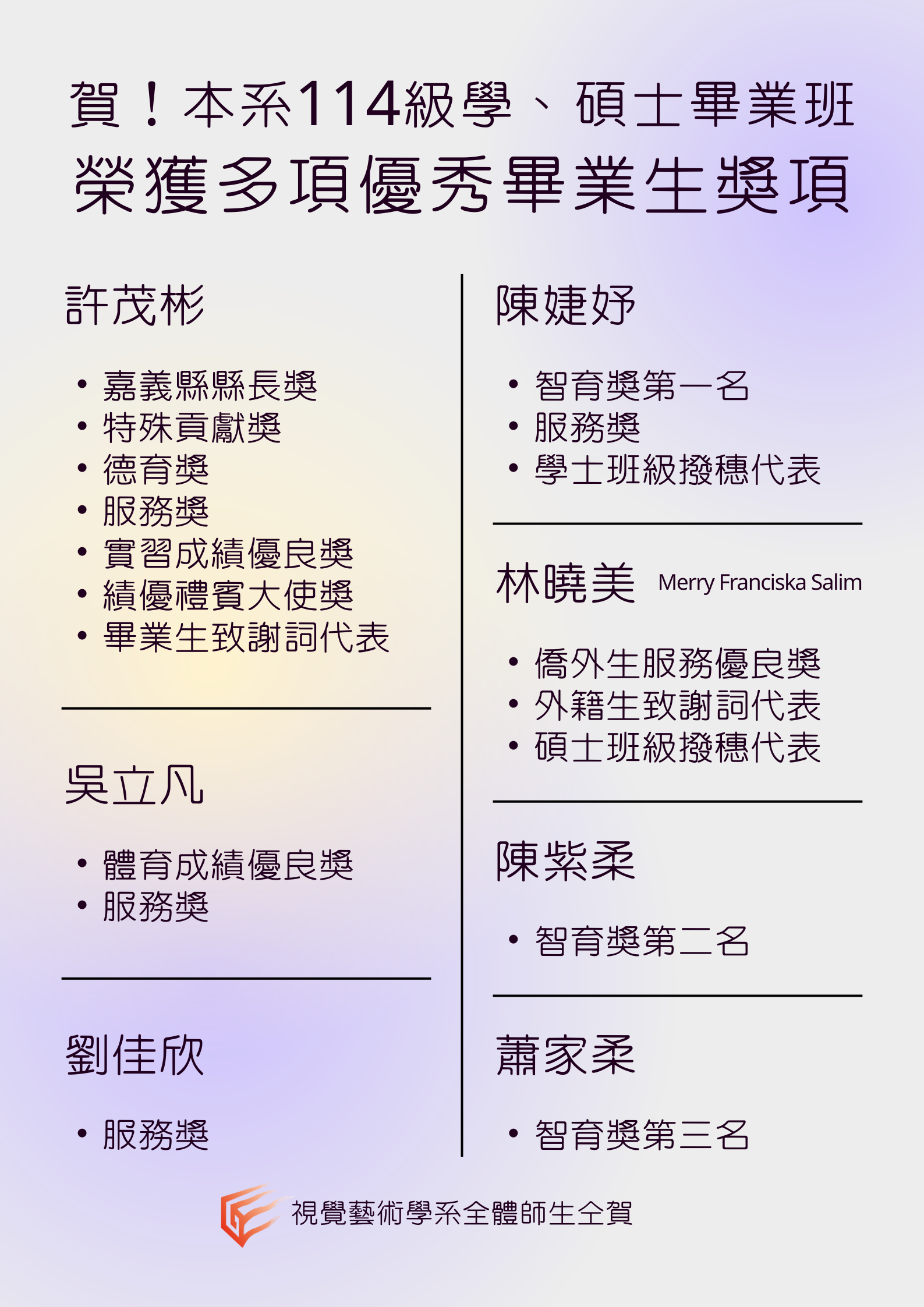 | 2025/05/05 | 一般消息 | 賀本系114級學碩士畢業班榮獲多項優秀畢業生獎項 | 視覺藝術系暨研究所 |