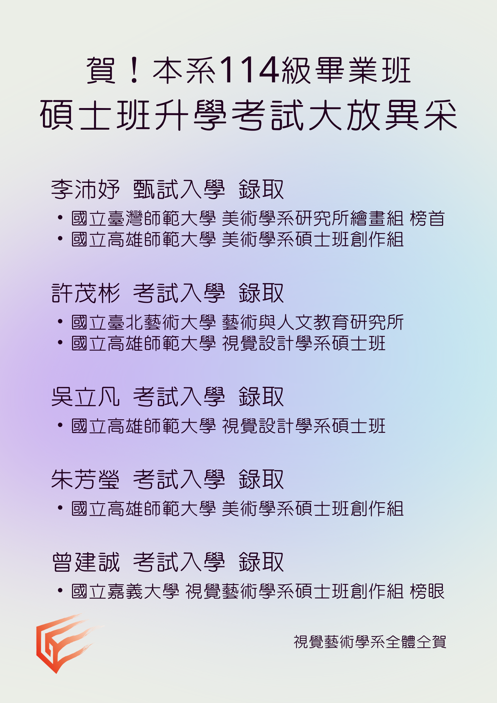 | 2025/03/31 | 一般消息 | 賀本系114級畢業班碩士班升學考試大放異彩 | 視覺藝術系暨研究所 |