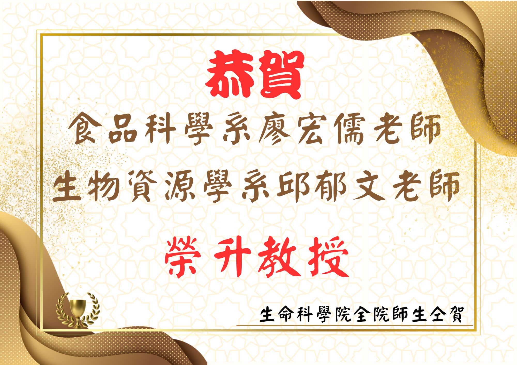 賀!食品科學系廖宏儒老師、生物資源學系邱郁文老師,榮升教授,全院師生仝賀。