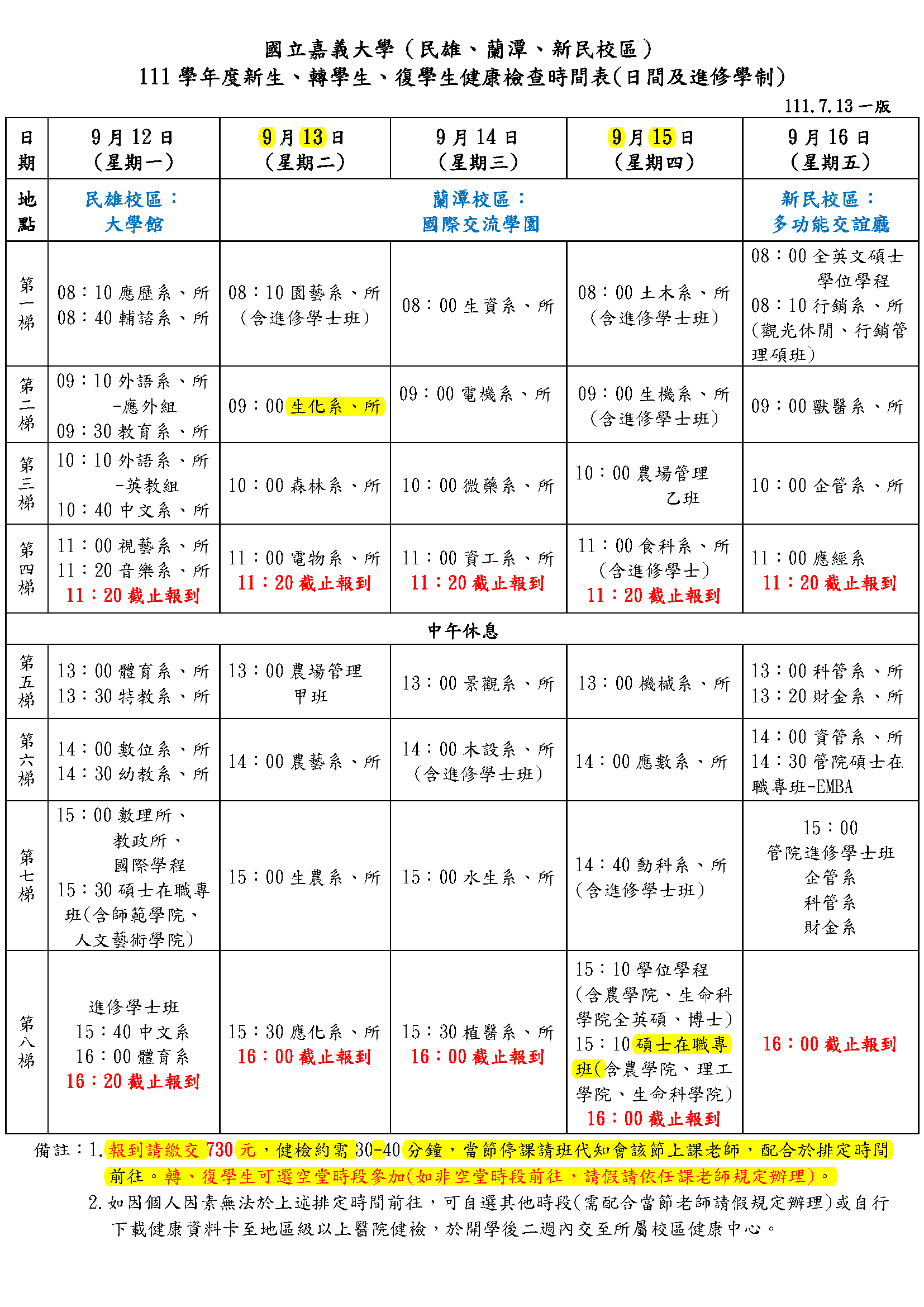 111學年新生健康檢查時間