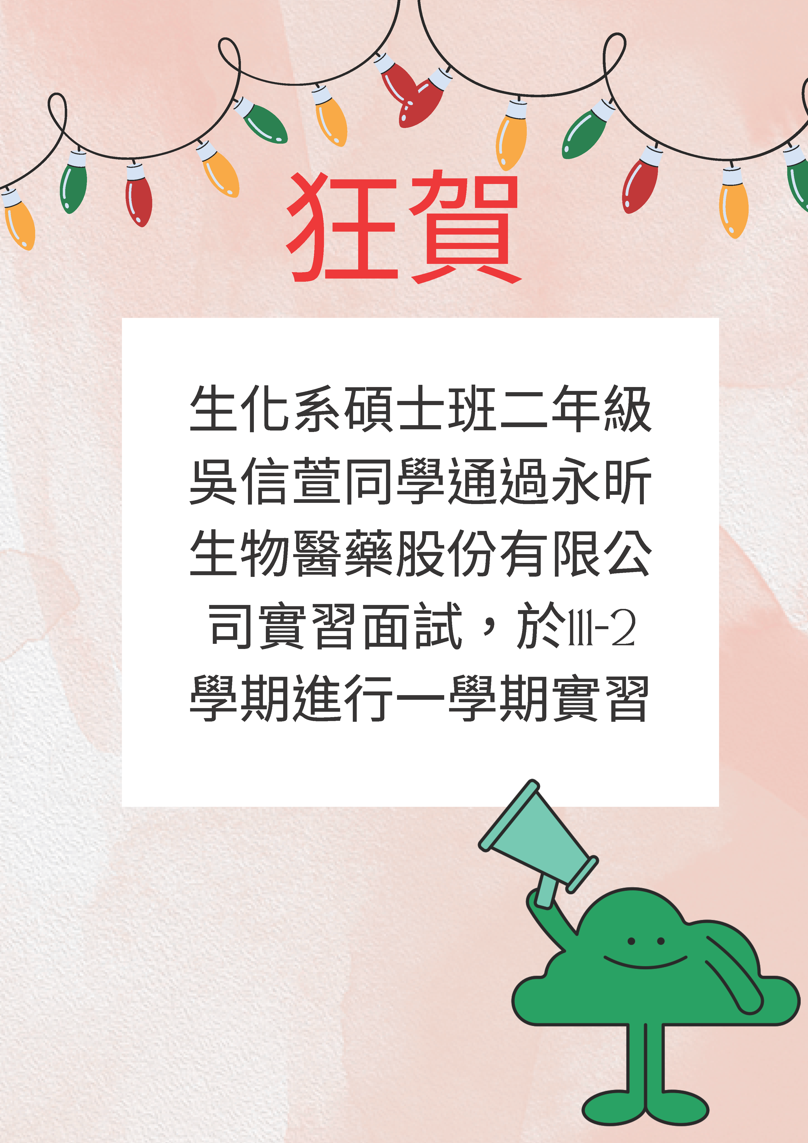 111-2碩士班二年級吳信萱同學獲得永昕生物醫藥股份有限公司實習機會