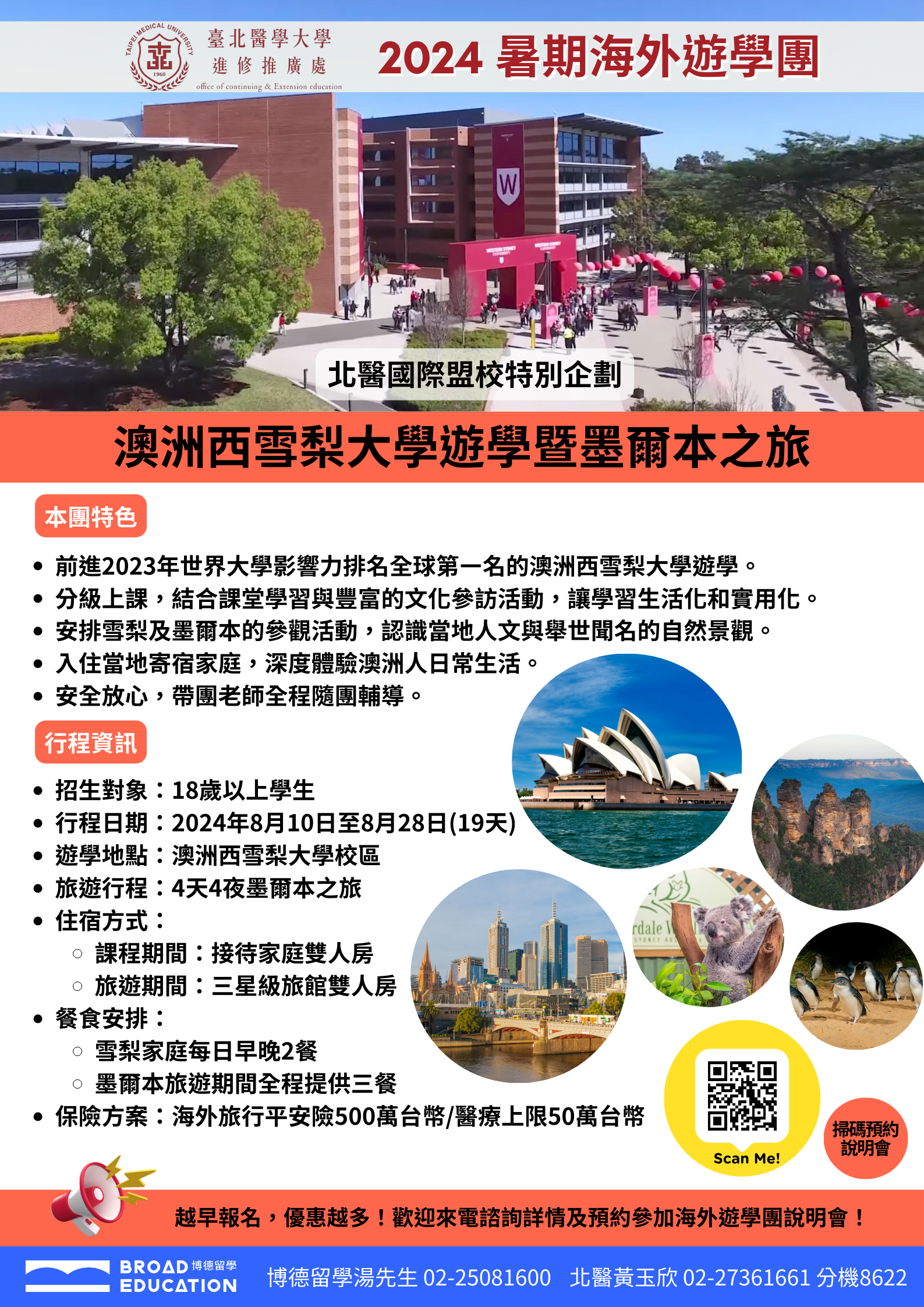 臺北醫學大學辦理「北醫國際盟校特別企劃:2024澳洲西雪梨大學遊學團暨墨爾本之旅」文宣