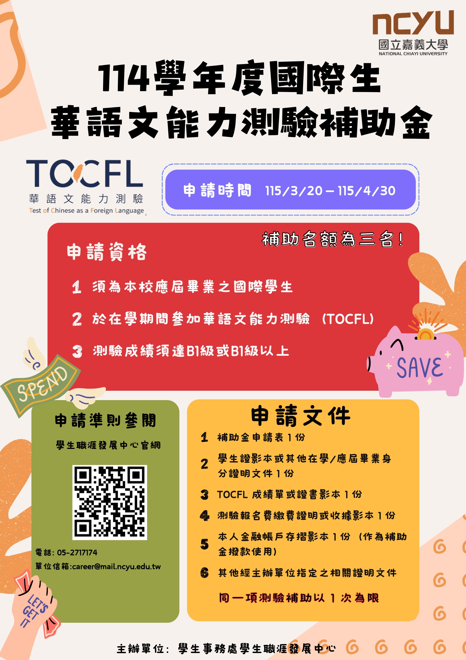 為鼓勵本校國際學生提升華語能力,並提高華語文能力達 B1 級之通過率,114 學年度特設置「華語文能力測驗補助金」,鼓勵本校國際學生參加 華語文能力測驗(Test of Chinese as a Foreign Language, TOCFL)。