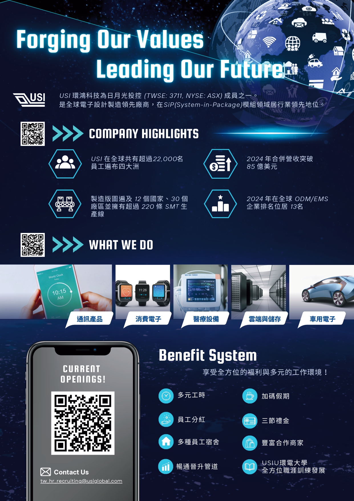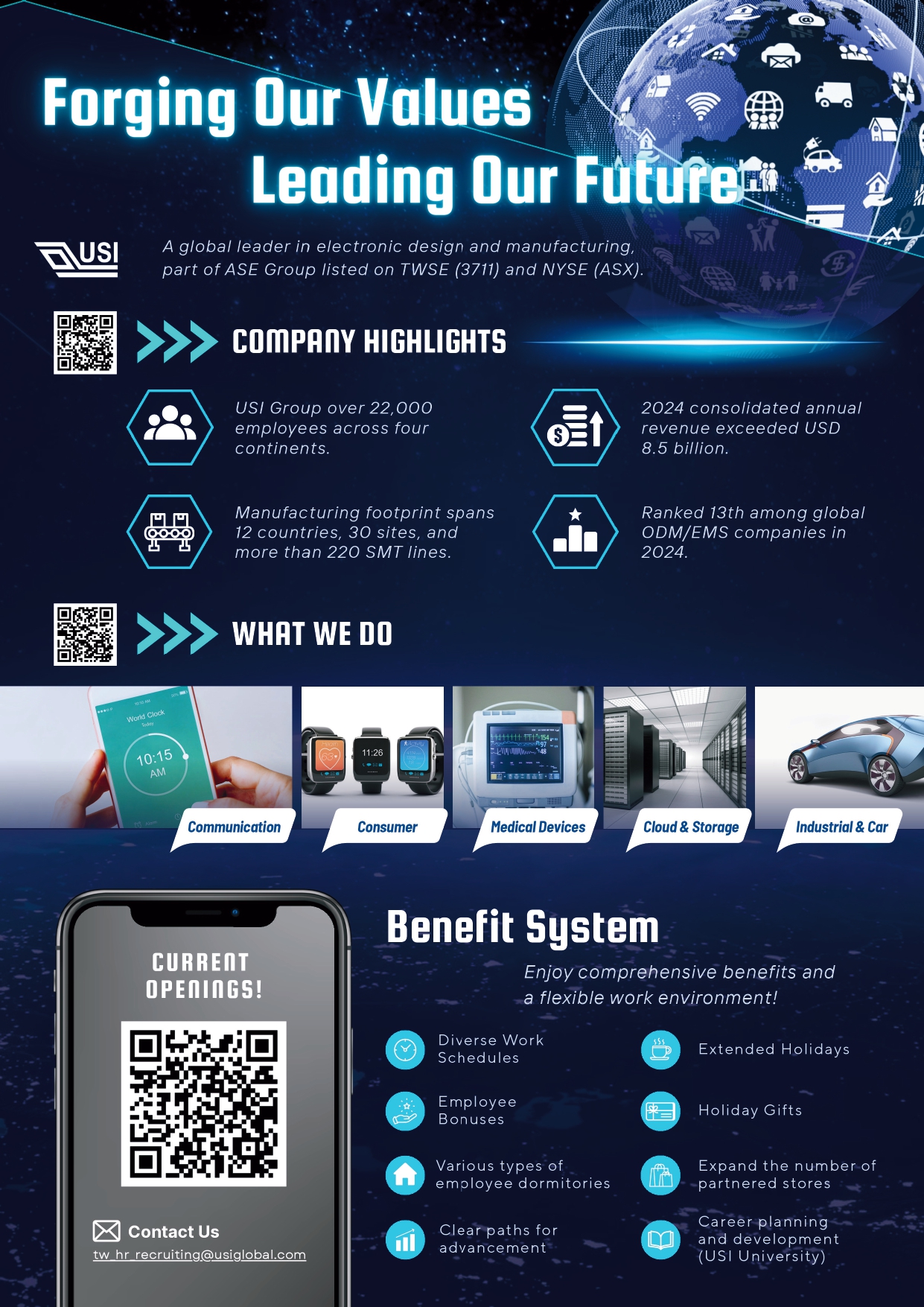 環鴻科技 (USI), a member of ASE Technology Holding, is a global leader in Electronics Manufacturing Services (EMS) and System-in-Package (SiP) solutions. With over 22,000 employees worldwide, USI operates across multiple regions, offering a truly international working environment.