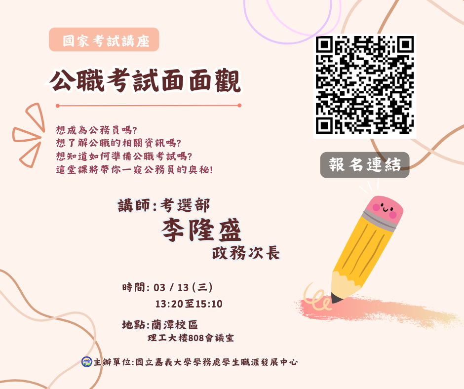 | 2024/03/01 | 113年3月13日國家考試-公職考試面面觀 | 學生職涯發展中心 | |