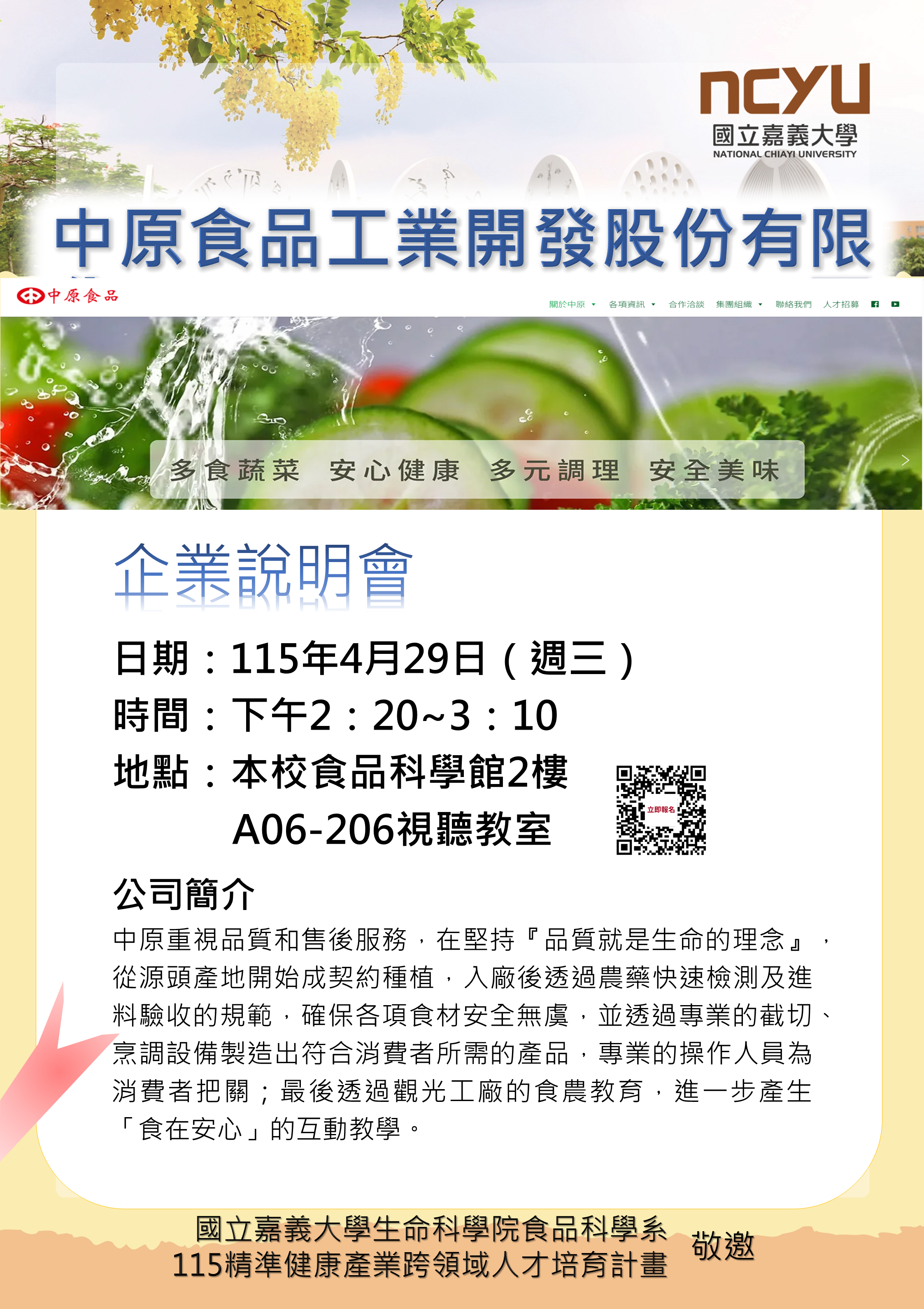 115年4月29日中原食品企業說明會在食科(歡迎線上報名)