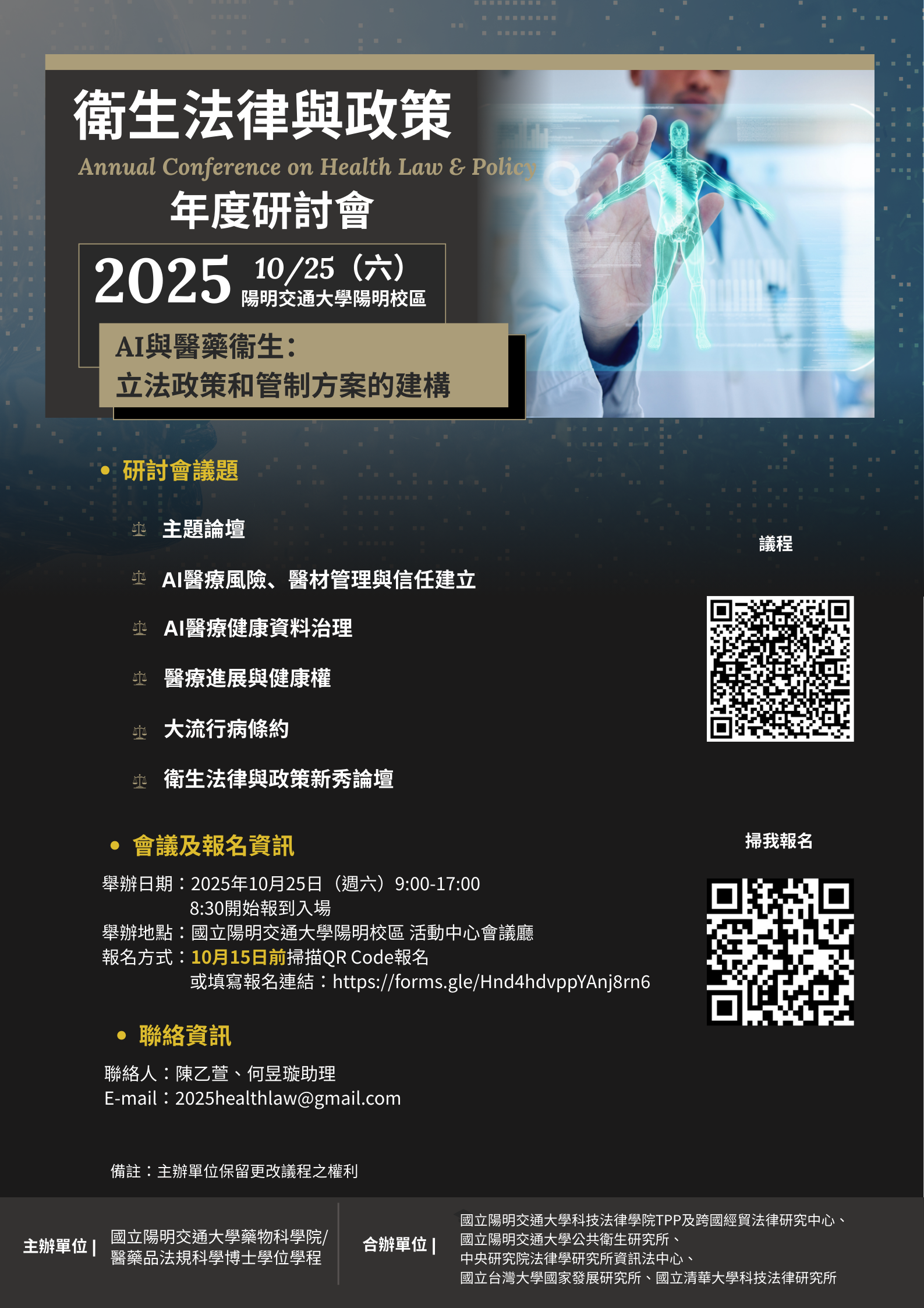 二、即日起開放報名至10月15日(星期三)截止,報名網址:https://forms.gle/Hnd4hdvppYAnj8rn6。活動聯絡人:陳乙萱、何昱璇助理,E-mail:2025healthlaw@gmail.com。