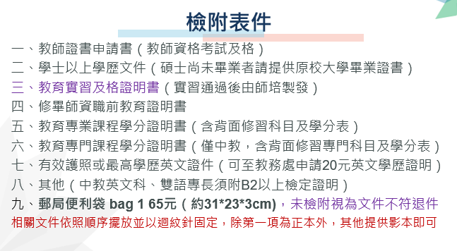 三、教師證書申請書及相關需檢附文件請詳閱附檔,另請備齊審查文件依序由上而下排列並以迴紋針固定於左上角,資料不全者,將通知補件,請於通知補件後五個工作天內完成補件,未完成補件者,不予受理。