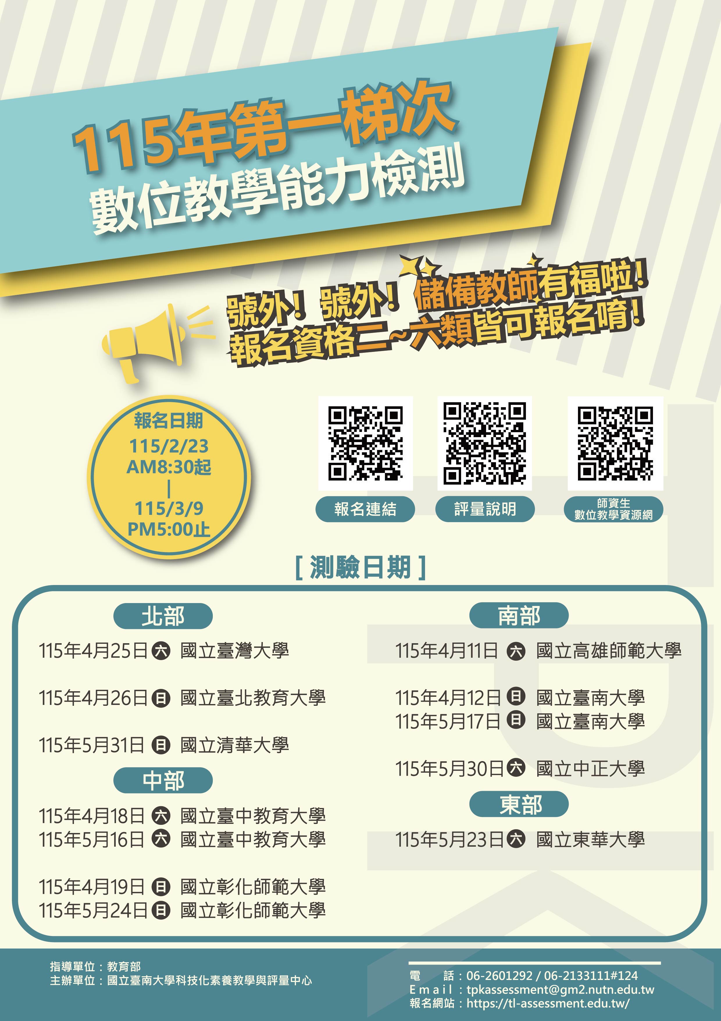 有關教育部委由國立臺南大學辦理115年第一梯次數位教學能力檢測相關事宜一案,請鼓勵師資生、儲備教師及實習學生踴躍參加,詳如說明,請查照。