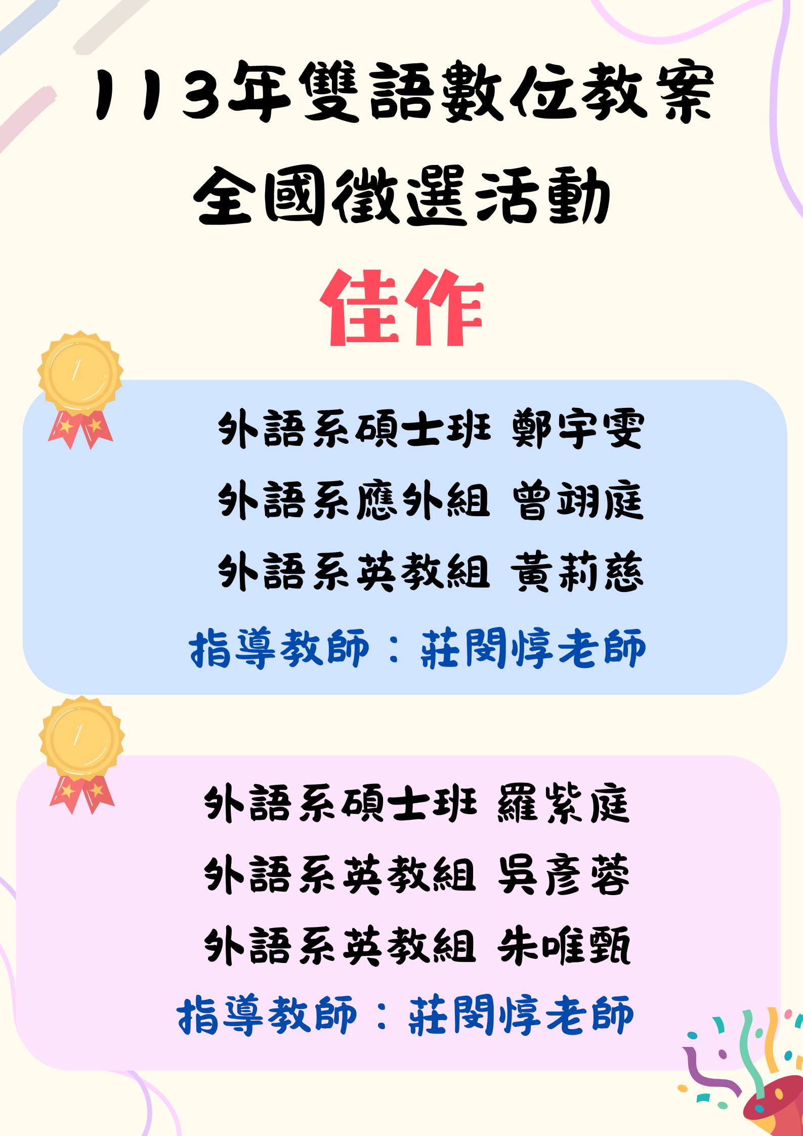| 2024/10/21 | 本系113年雙語數位教案獲獎名單 | 外國語言學系暨研究所 | |