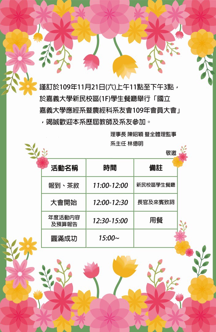 | 2020/09/25 | 國立嘉義大學應用經濟系暨農業經濟科系友會訂於109年11月21日(六)11點~15點於新民校區多功能交誼廳109年舉行會員大會暨餐。 | 應用經濟學系 | |