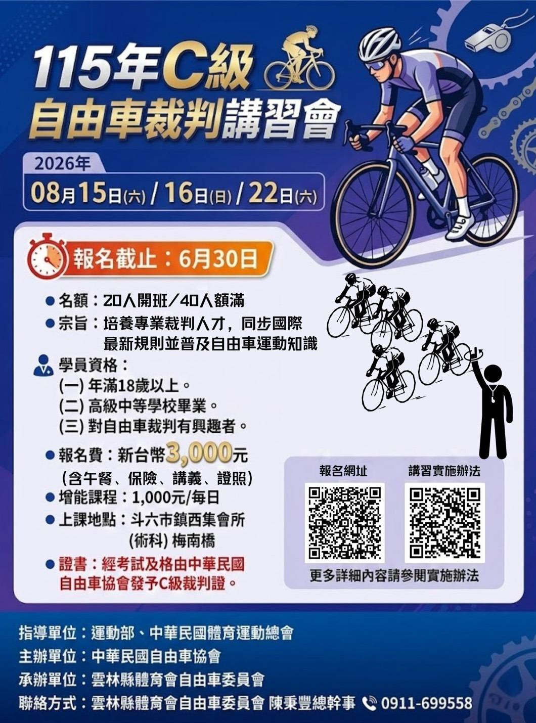 | 2026/04/11 | 115年C級自由車裁判講習會(報名至115年6月30日) | 體育與健康休閒學系 | |