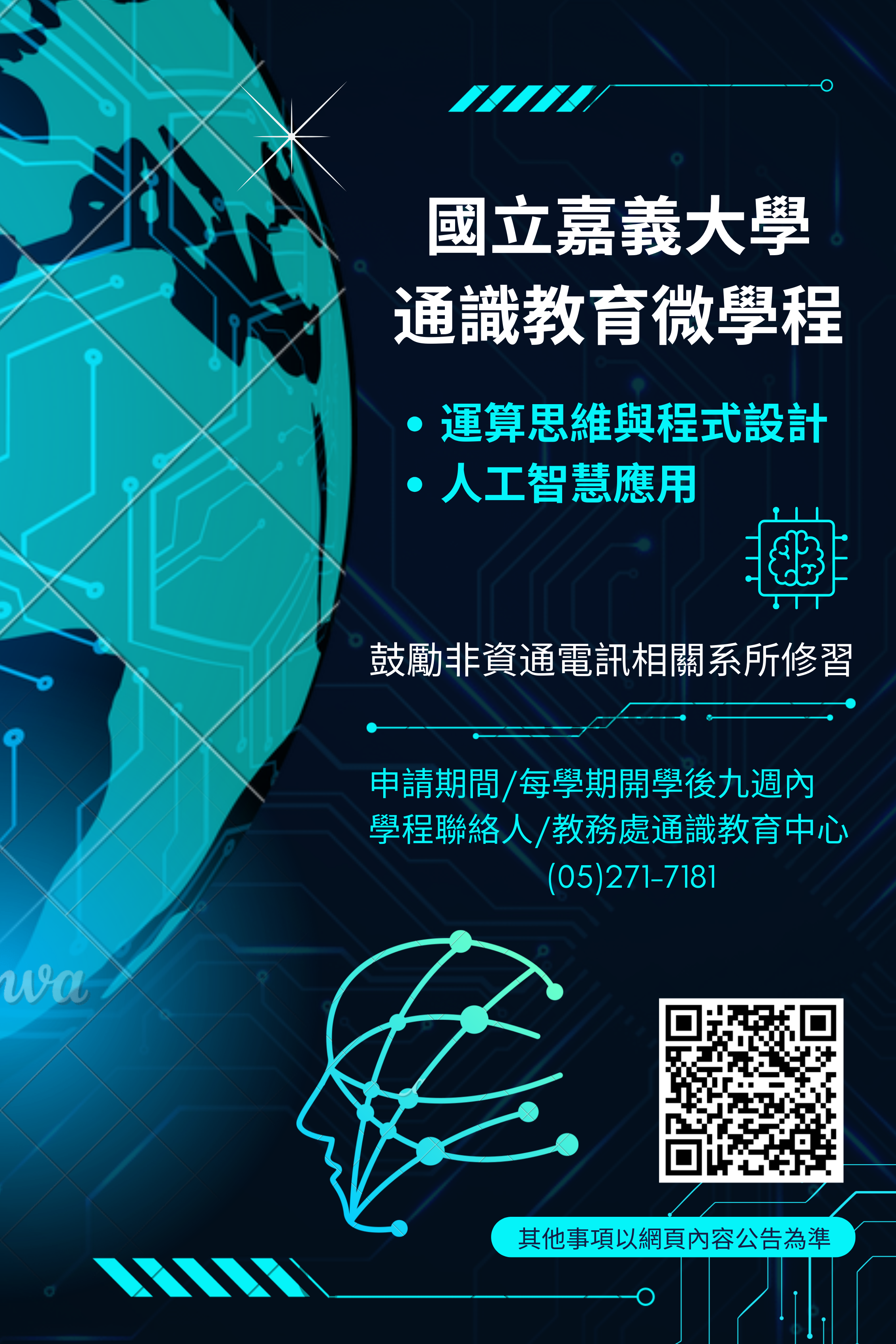 四、 有關通識教育微學程之法規、申請及作業規劃(包含修習條件與規定、課程規劃與師資規劃)及修讀申請表,請至國立嘉義大學教務處通識教育中心/通識教育課程資訊/通識教育微學程網站查詢:https://reurl.cc/nvWWnn,電話:(05)2717181。