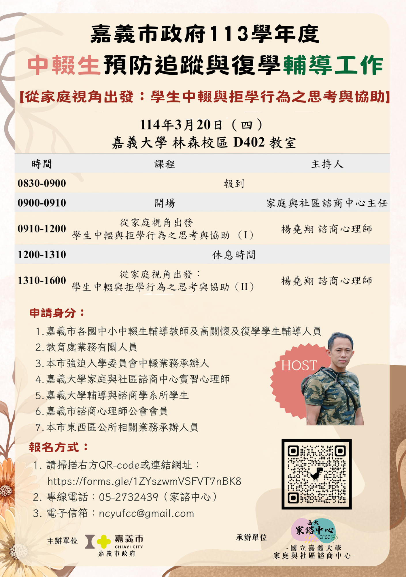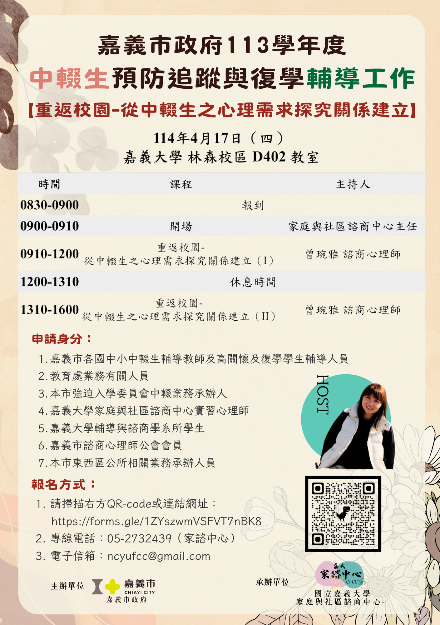 本中心114年3月20日(四)、4月17日(四)辦理嘉義市113學年度中輟生預防追蹤與復學輔導工作實施計畫–中輟復學輔導知能研習