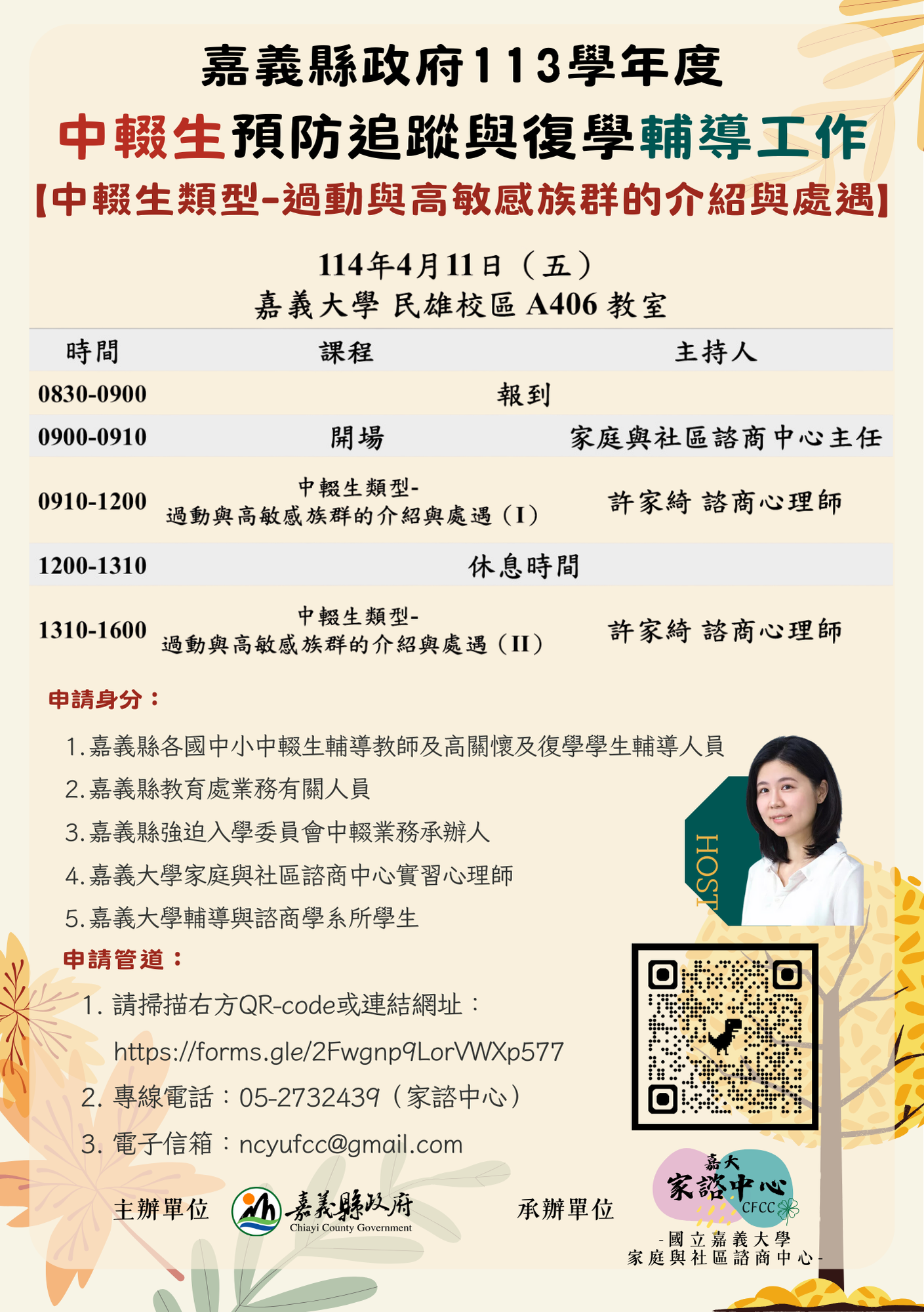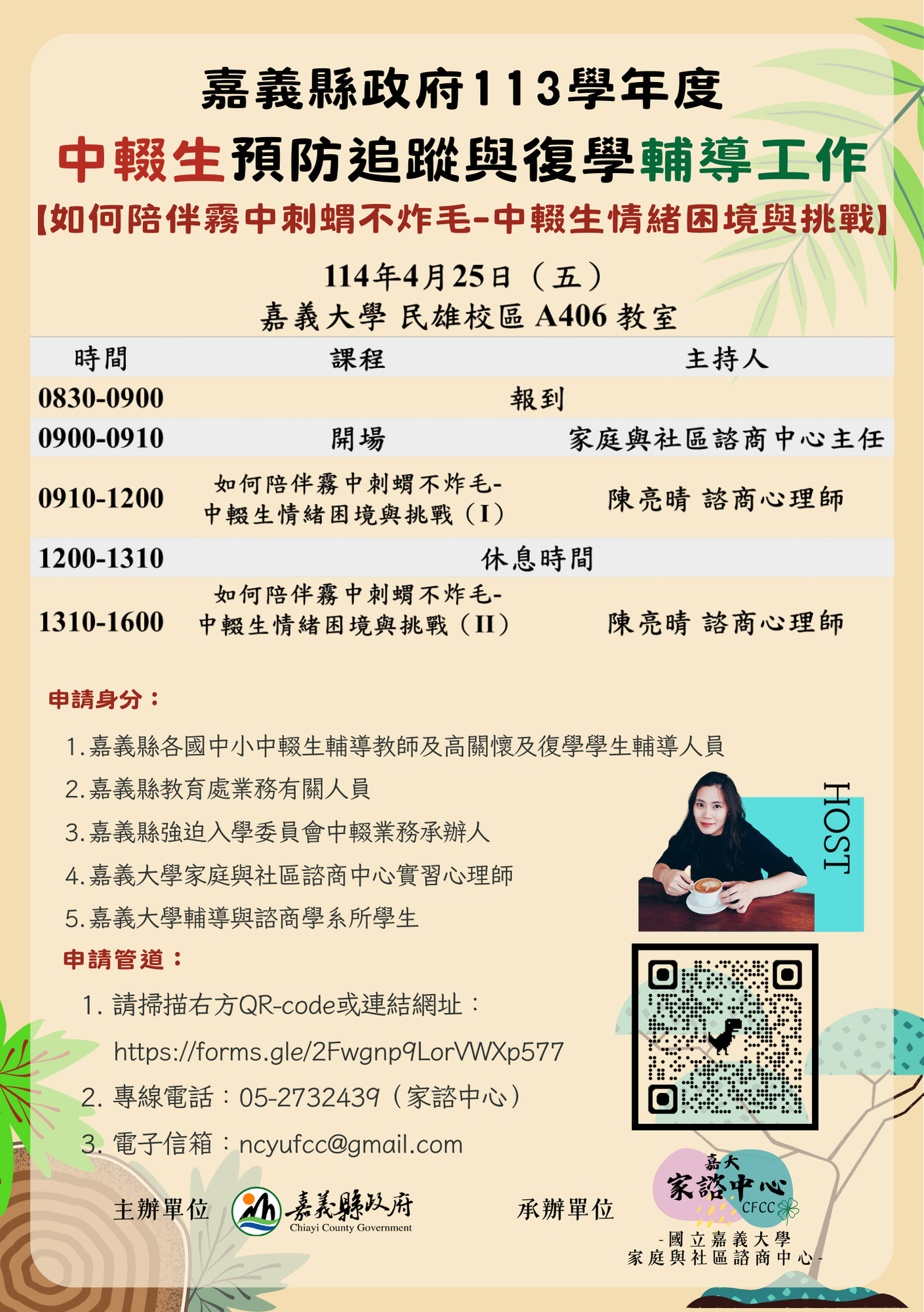 本中心114年4月11日(五)、4月25日(五)辦理嘉義縣113學年度中輟生預防追蹤與復學輔導工作實施計畫–中輟復學輔導知能研習