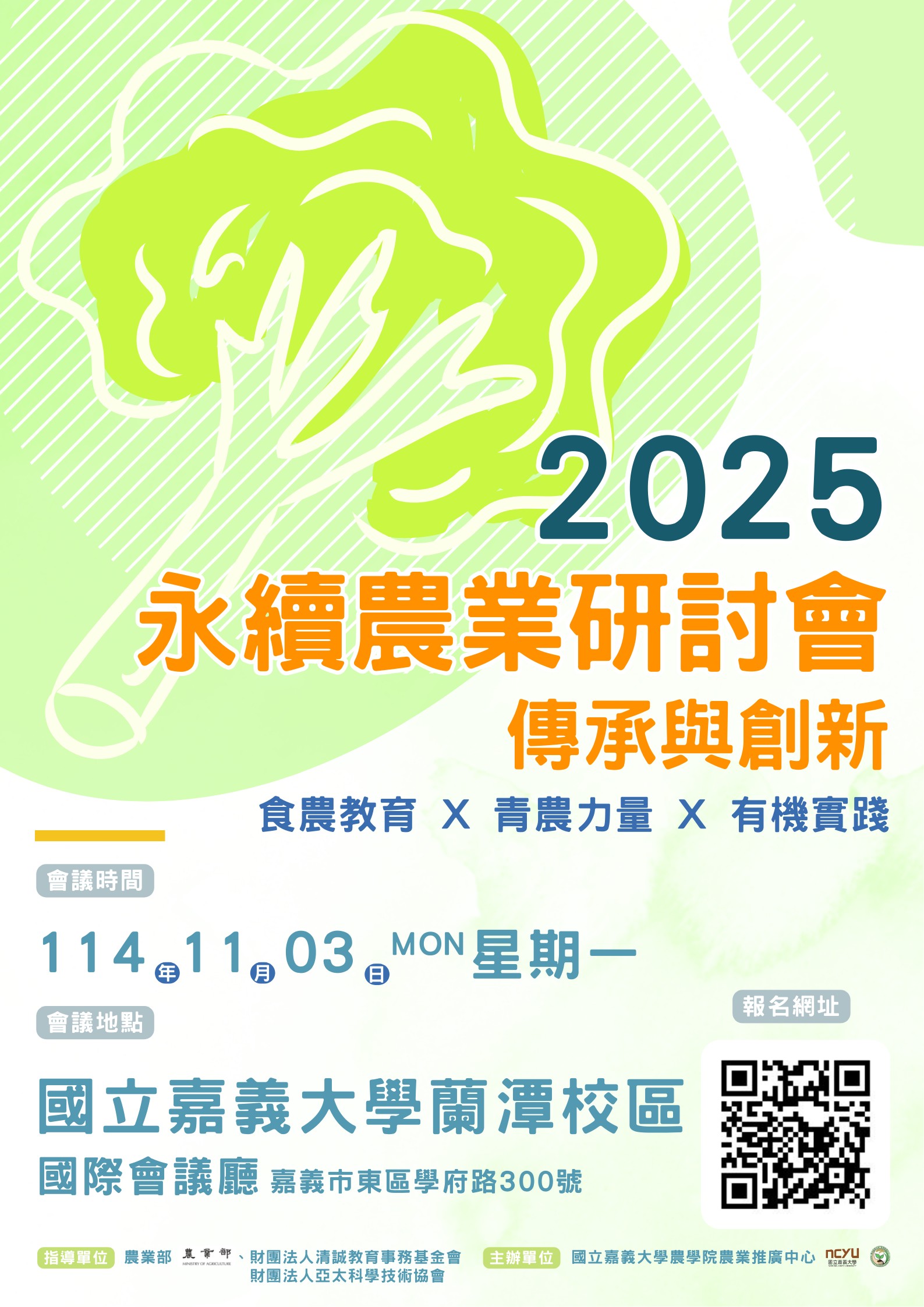 主旨:本校農學院農業推廣中心謹訂於114年11月3日(星期一)辦理「2025永續農業研討會-傳承與創新(食農教育 × 青農力量 × 有機實踐)」,敬邀蒞臨參加