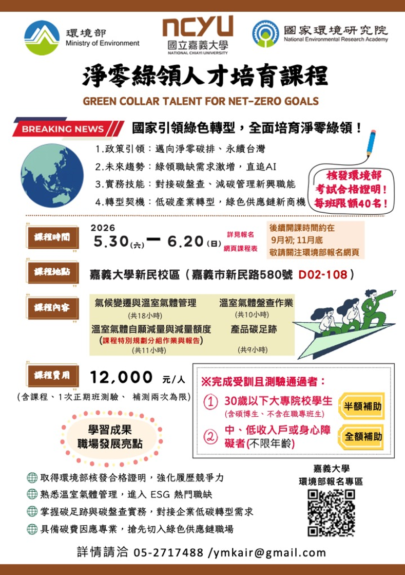 【環境部課程】淨零綠領人才培育課程 第11565期(嘉義大學 第五期)開班 (5/30-6/20),考試合格可取得環境部合格證書!