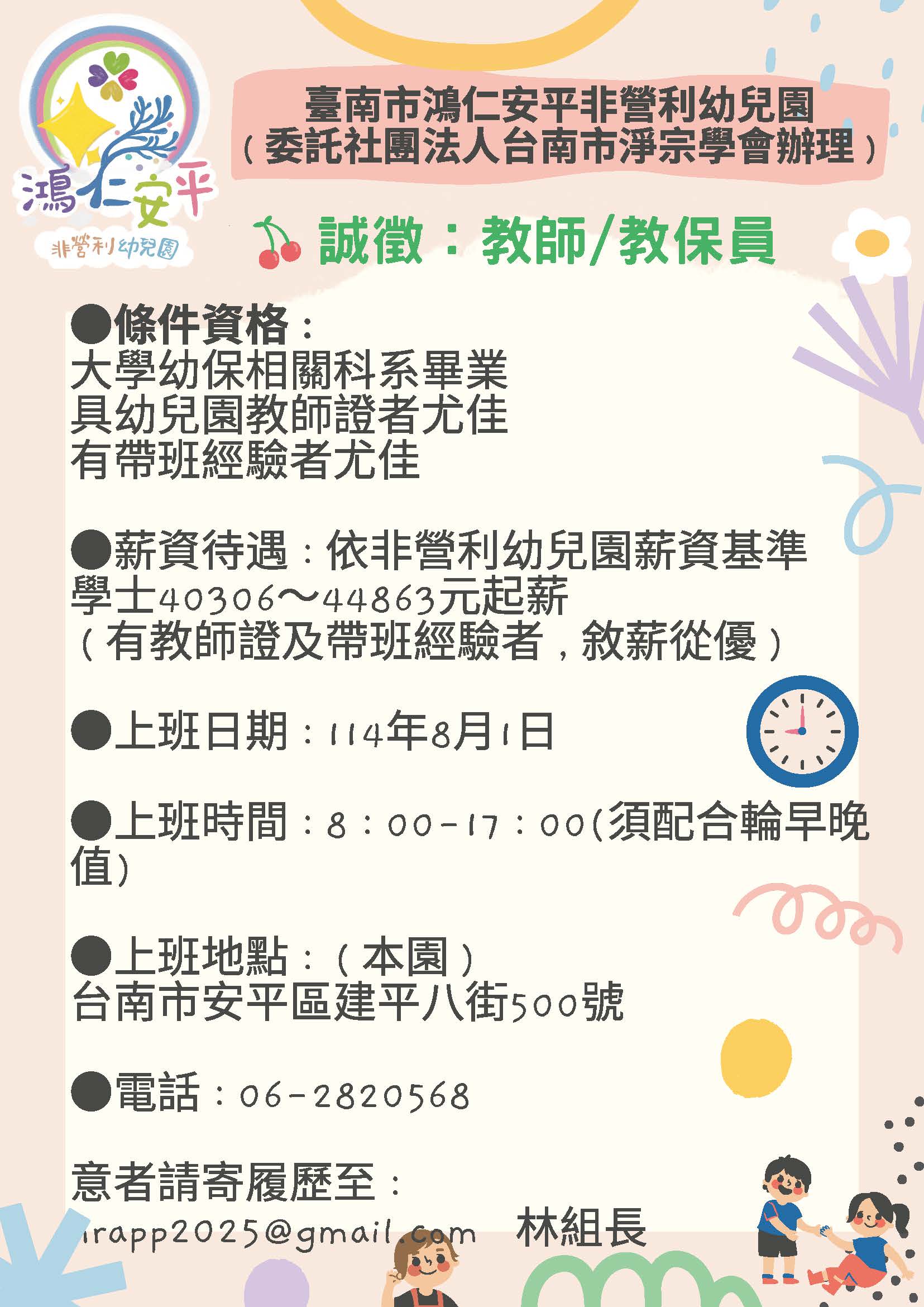 臺南市鴻仁安平非營利幼兒園徵才