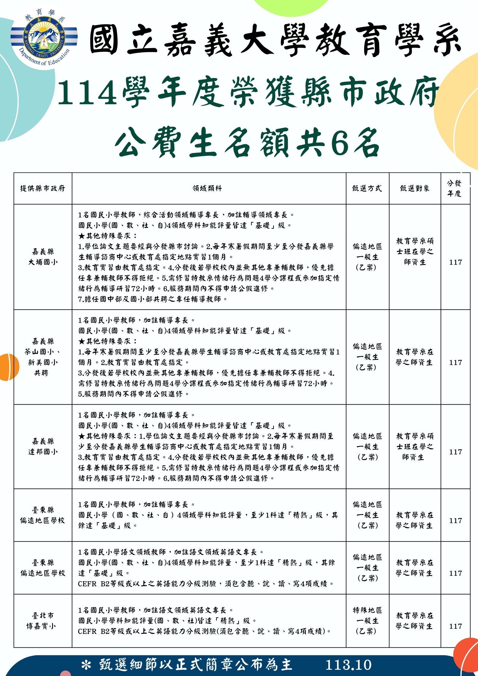 | 2025/06/13 | 114年度嘉義縣輔導專長公費生甄選時程表+注意事項 | 教育學系數理教育碩士班 | |