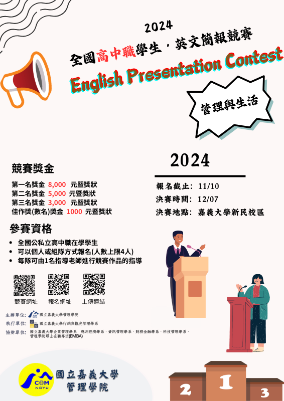 嘉義大學管理學院舉辦「2024全國高中職學生.英文簡報競賽 」,報名時間:即日起至113年11月10日止。(1131011)