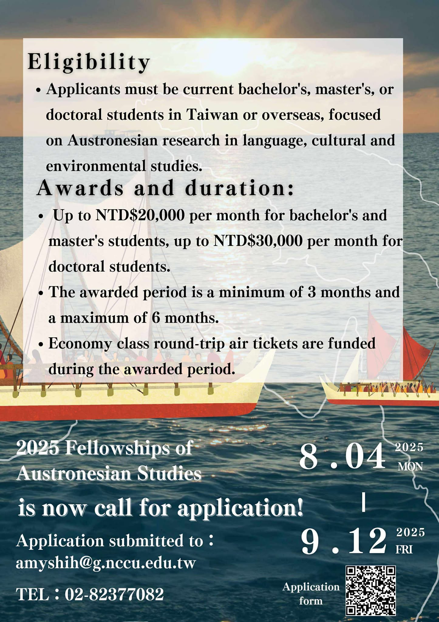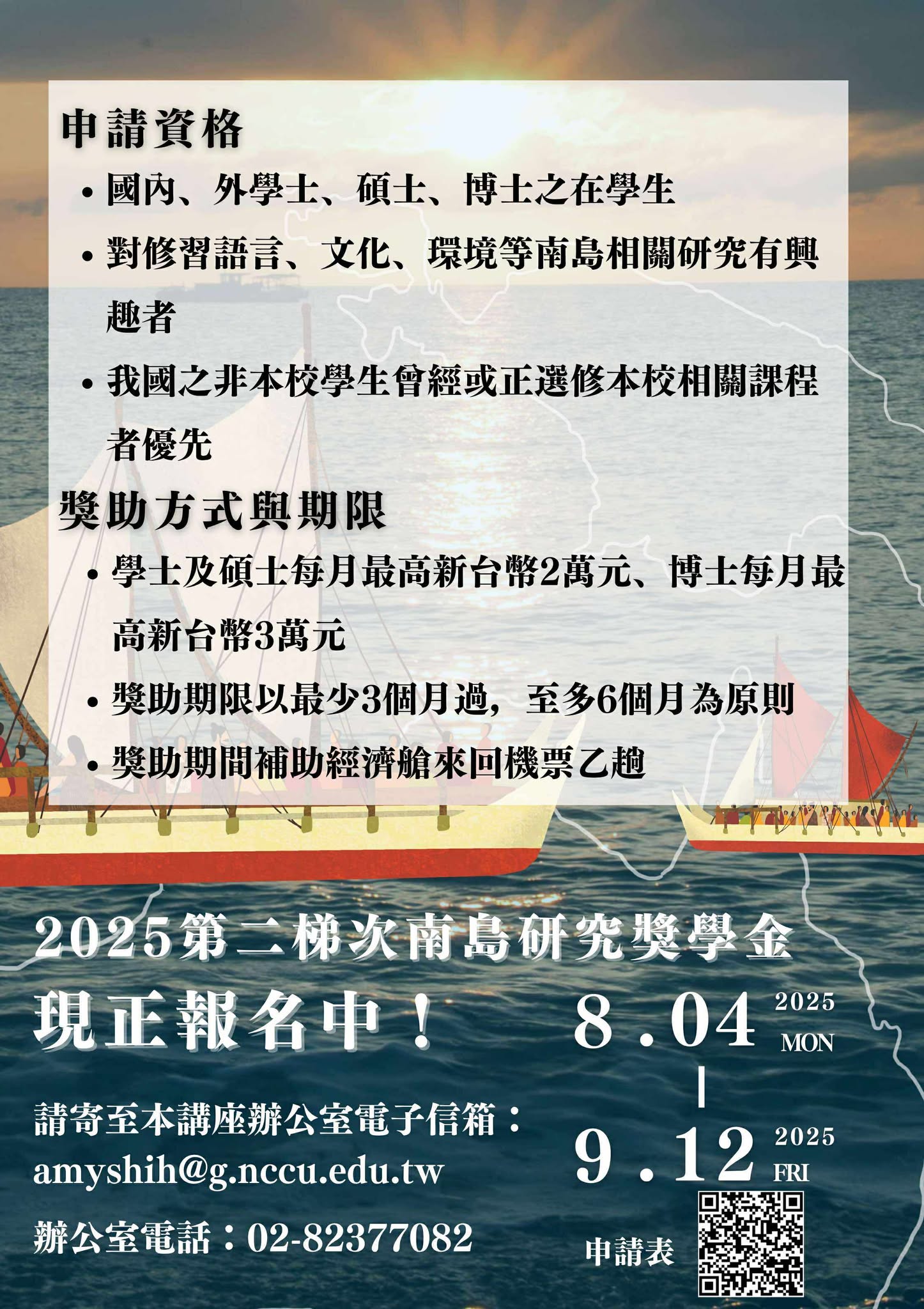 四、檢附南島研究講座研究獎學金作業要點、中英文宣傳海報、中英文申請表各一份。
