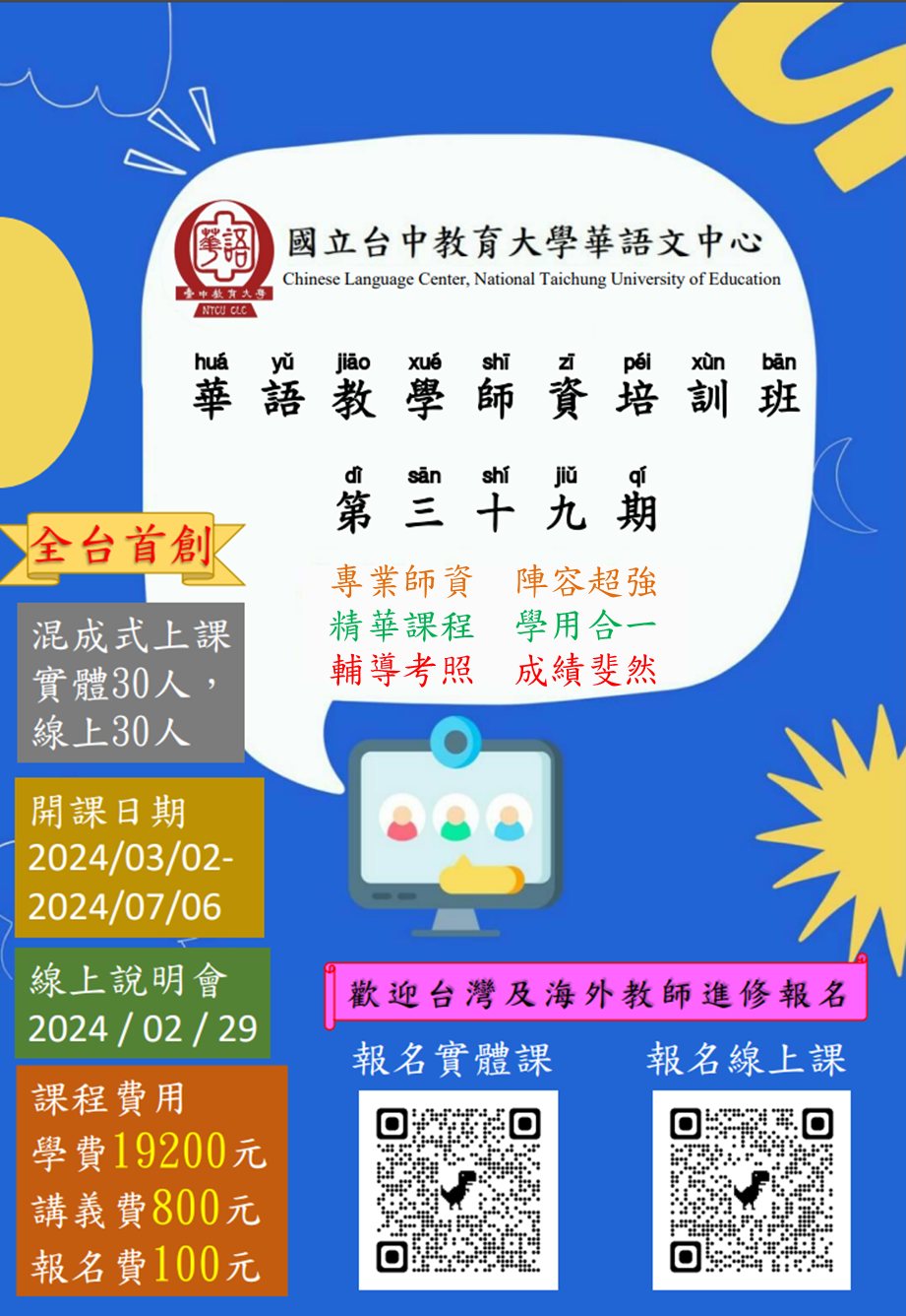 國立臺中教育大學進修推廣部華語文中心開設「第39期華語師資培訓班-混成式上課」,請踴躍報名。