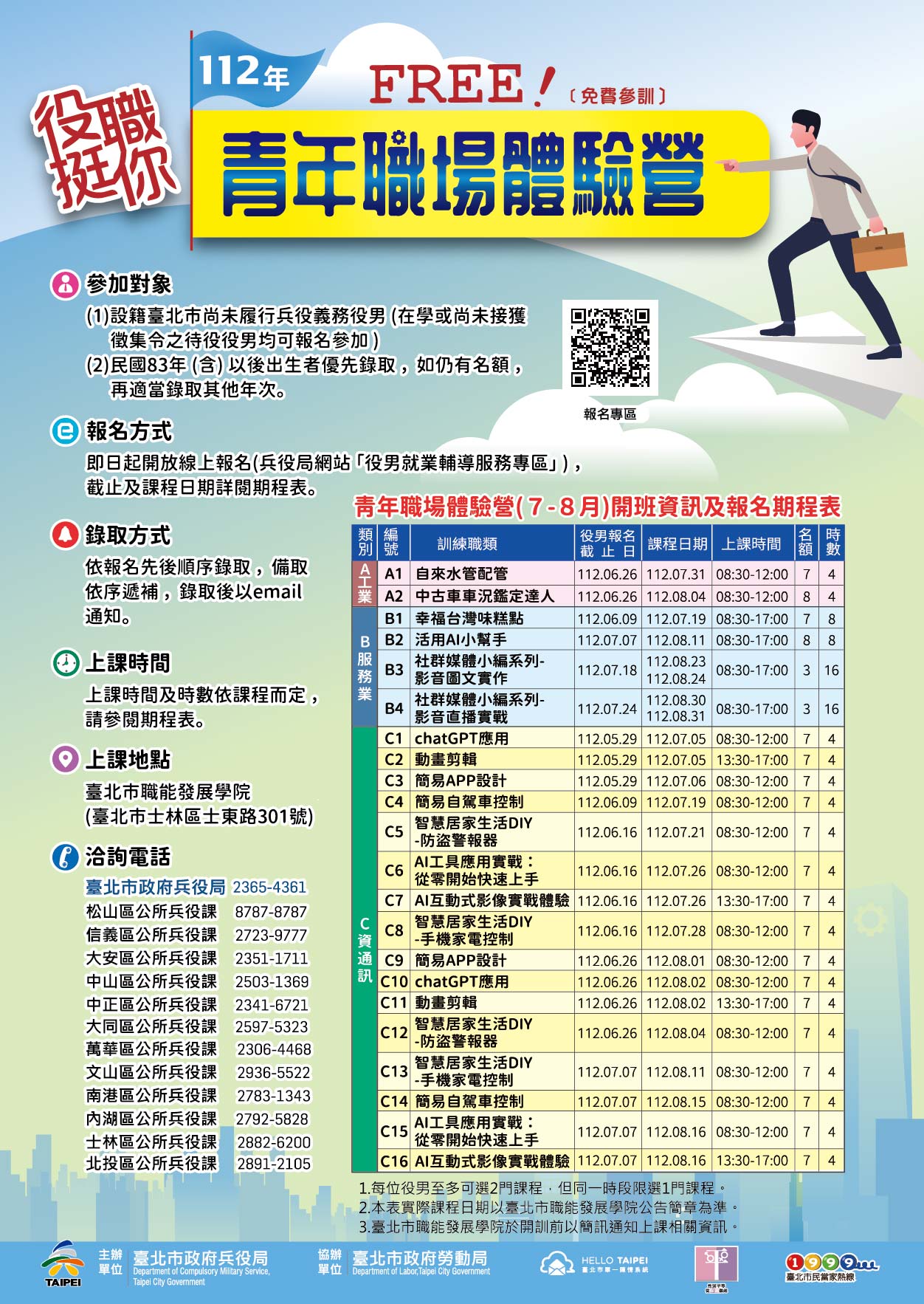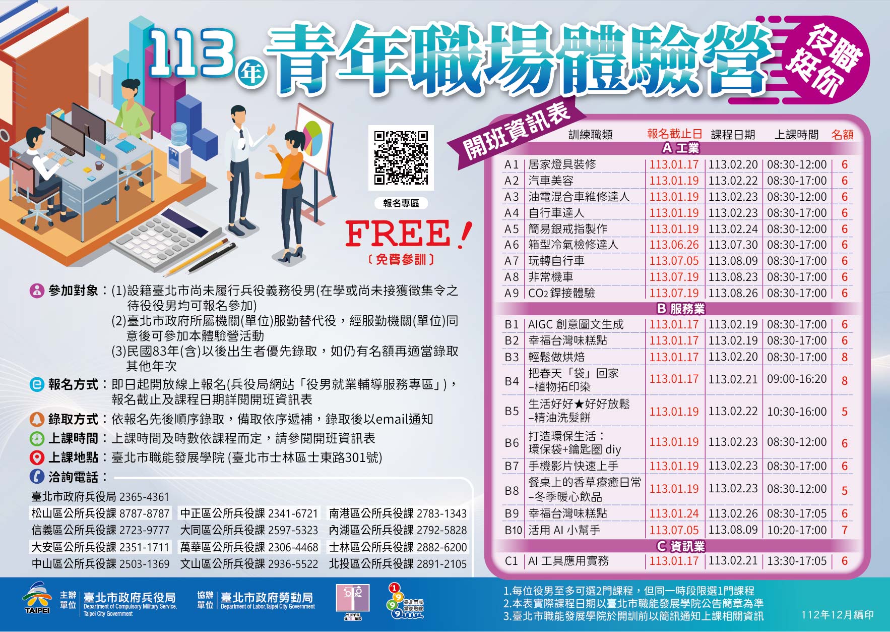 | 2024/01/02 | 臺北市政府兵役局辦理113年「青年職場體驗營」活動 | 軍訓組 | |