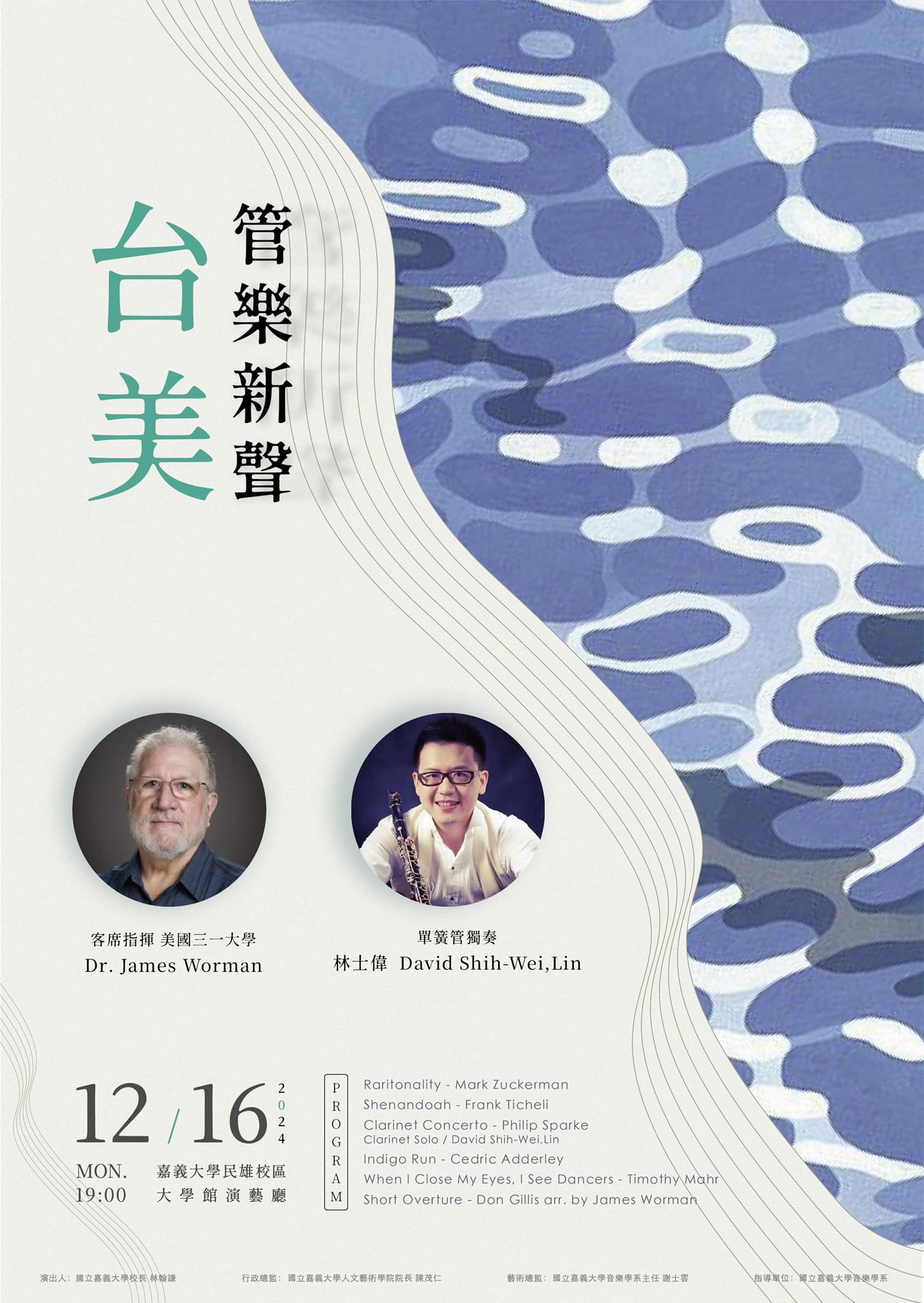 | 2024/12/13 | 校園活動 | 敬邀聆聽嘉義大學管樂團-台美管樂新聲音樂會 | 音樂學系 |