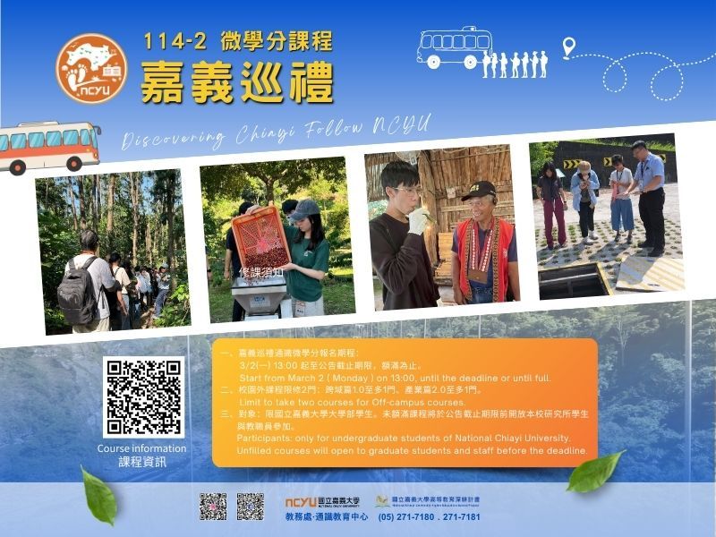 2026.02.25115學年度大學學測成績揭曉,考生正式進入志願選填關鍵階段,為協助考生與家長在多元入學制度下做出更適切選擇,嘉義大學配合大學選才與高中育才輔助系統計畫「2026 ColleGo! 大學 OPEN DAY」及校內生命科學院開放日系列活動,啟動「雙軌招生」策略,結合線上平台與實體活動,全面強化學系資訊揭露與互動交流,期盼在適性選才理念下,引導學生依興趣與能力審慎規劃升學方向。 嘉義大學整合全校學系社群資源,透過全國性高中學生升學探索平台(https://collego.edu.tw/Media/Article/2555)學系影片介紹、直播對談、社群連結建構多元資訊管道,讓考生與家長可透過IG、Facebook、LINE等社群平台直接與有興趣之學系聯繫詢問,以掌握課程特色、選才理念與職涯發展。同時於平台上傳幼兒教育學系、音樂學系、科技管理學系、資訊管理學系、生化科學系及生物資源學系等特色招生宣傳影片,讓學生感受從課堂學習到校園角落的風景與氛圍(https://reurl.cc/6bALek)。 全國跨校教授直播活動自3月7日至8日共二日,將由來自各大學教授齊聚26個學群線上分享(https://collego.edu.tw/Media/Event2026),解析學群核心能力與產業趨勢。嘉義大學於3月8日下午安排兩場專題直播,分別由體育與健康休閒學系主任許雅雯介紹學系特色與選才理念,科技管理學系副教授沈永祺說明教學重點與跨域發展方向;直播均開放線上提問,針對考生與家長常見迷思即時回應,提供專業建議。 除強化線上即時互動外,嘉義大學亦同步推動校園深度體驗,3月13日在蘭潭校區舉辦「2026嘉大生命科學院開放日」(https://website.ncyu.edu.tw/cls/Subject/Detail/234850?nodeId=2706),由生化科技學系、水生生物科學系、生物資源學系、食品科學系及微生物免疫與生物藥學系共同規劃,進行系所介紹、資源展示並透過實作小課程與闖關遊戲,帶您瞭解各系特色及生命科學最新發展,進而確立生涯志向。 圖1:「2026 ColleGo!大學OPEN DAY」嘉義大學各學系特色招生宣傳影片 圖2:115年3月13日「2026嘉大生命科學院開放日」系列活動海報