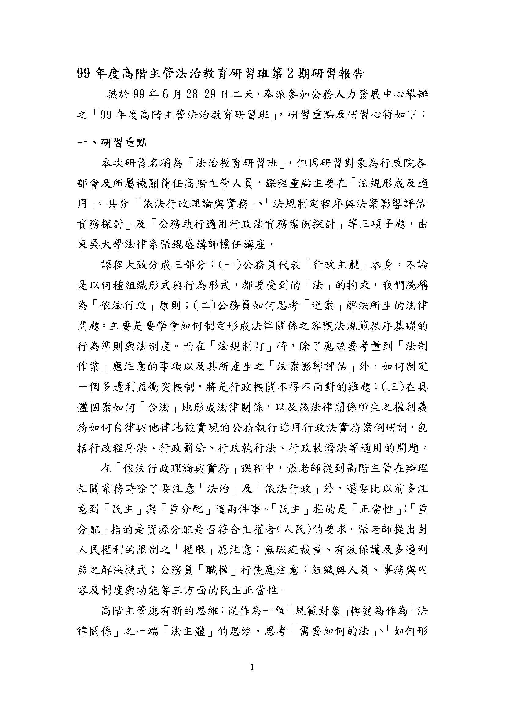 秘書室范惠珍專門委員「99年度高階主管法治教育研習班第2期」研習報告書