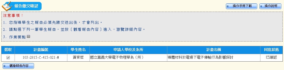 103學年度 科技部 大專學生參與專題研究計畫 一覽表