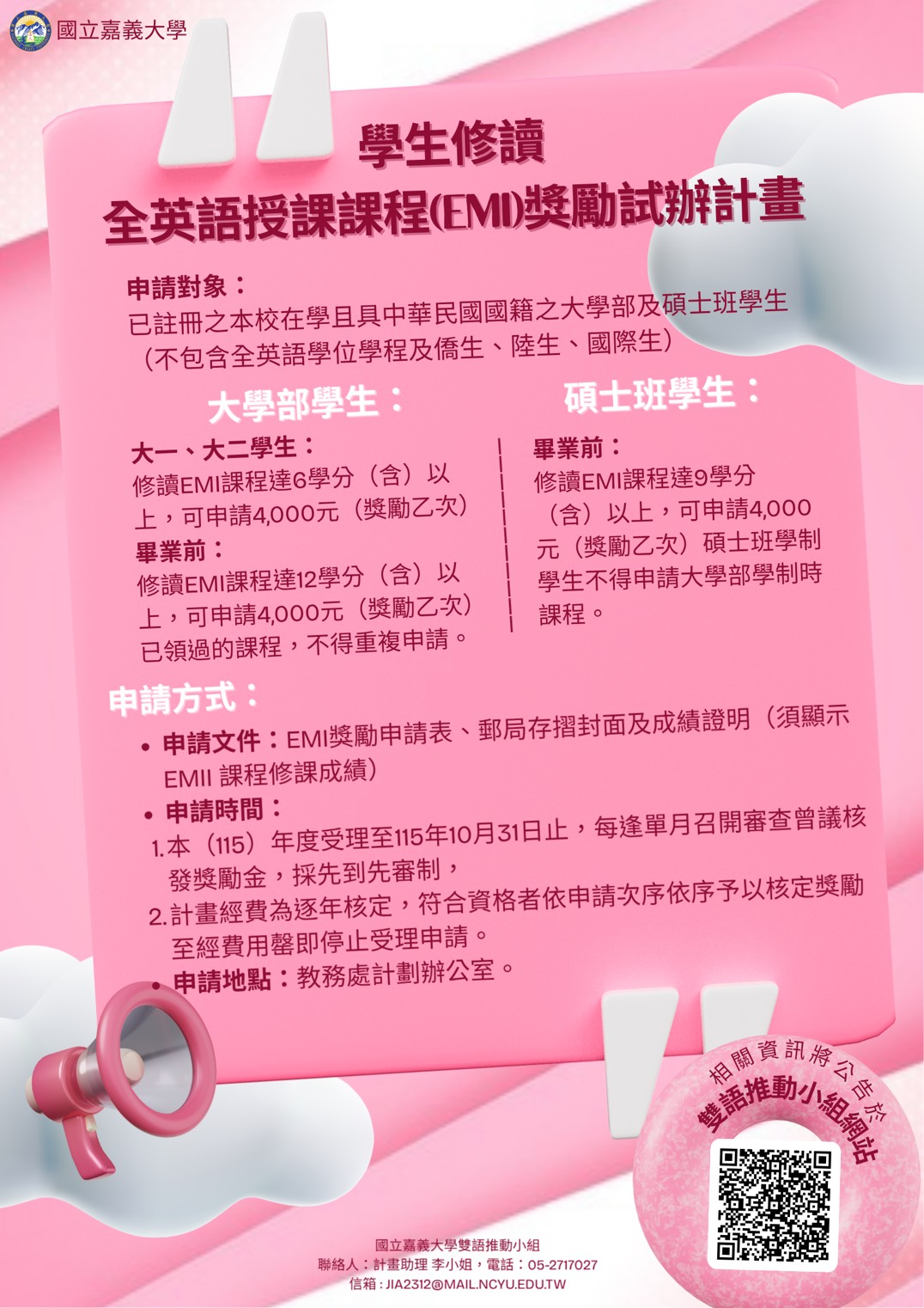 六、 檢附宣傳海報、申請表、學生修讀全英語授課課程(EMI)獎勵試