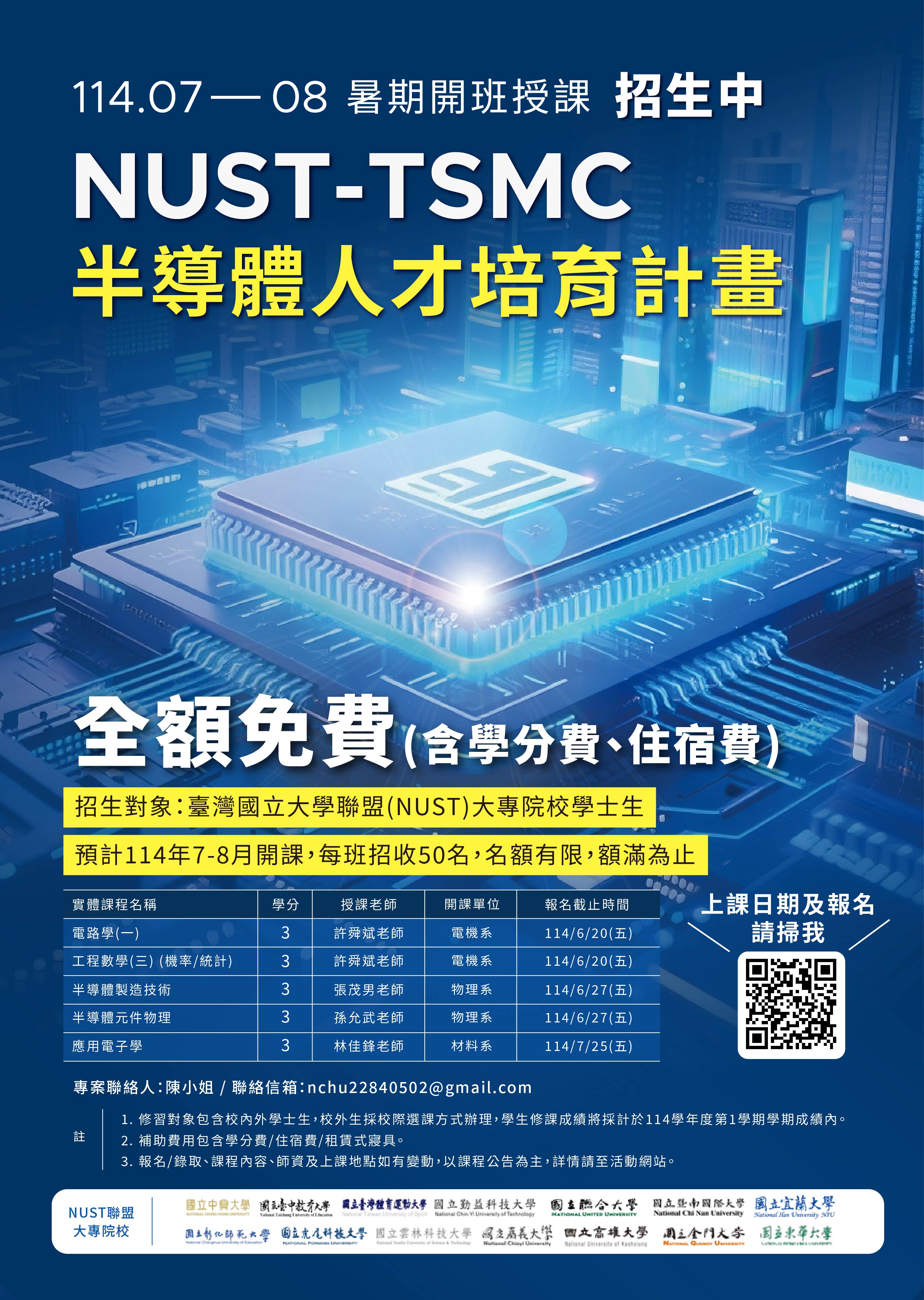 中興大學函知114年6月11日(星期三)18:30-20:00辦理「NUST-TSMC半導體人才培育計畫:暑期課程說明會」(線上),歡迎學生踴躍報名參加。