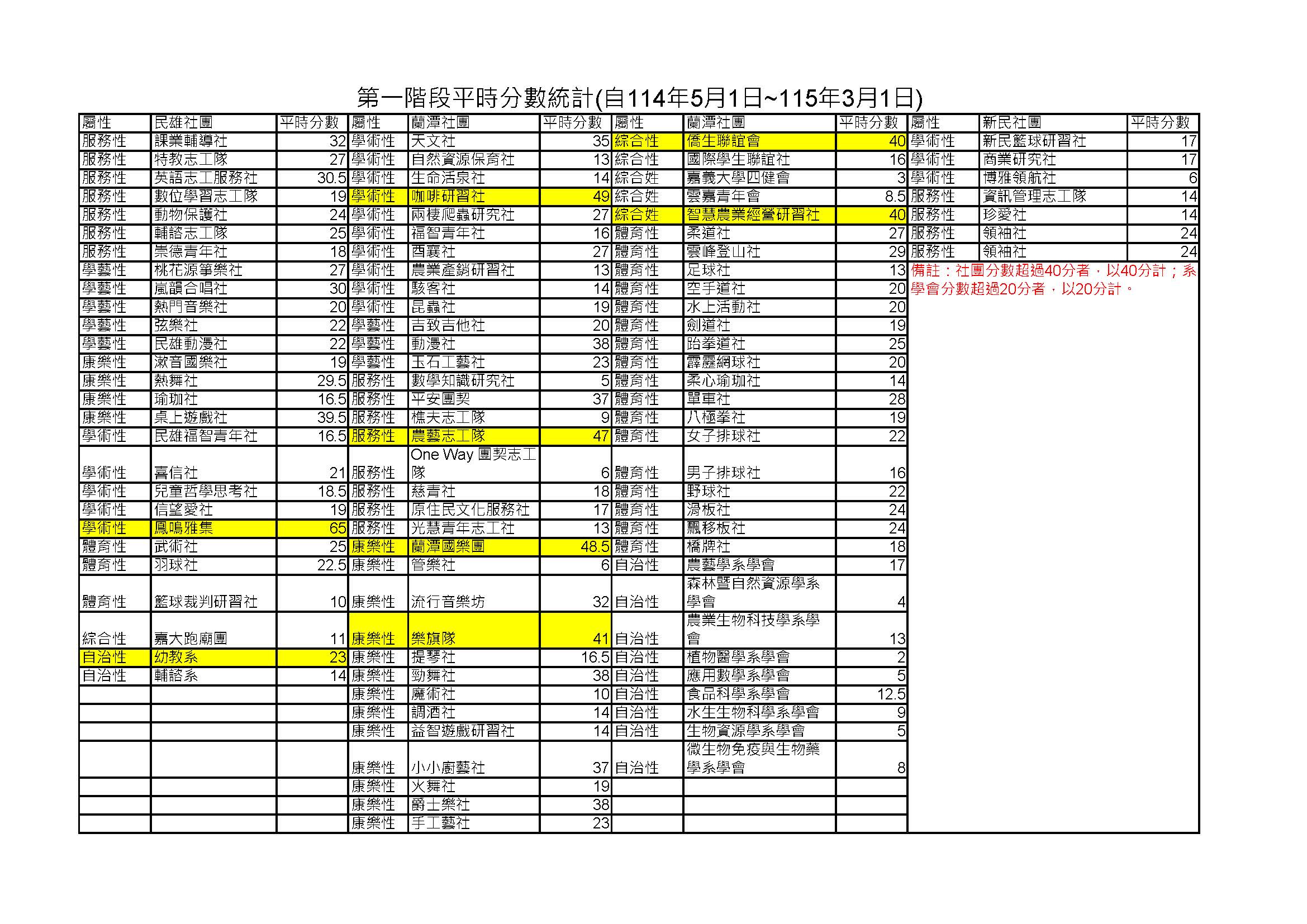 115年度學生社團評鑑平時成績第一階段結算結果(114.5.1-115.3.1)