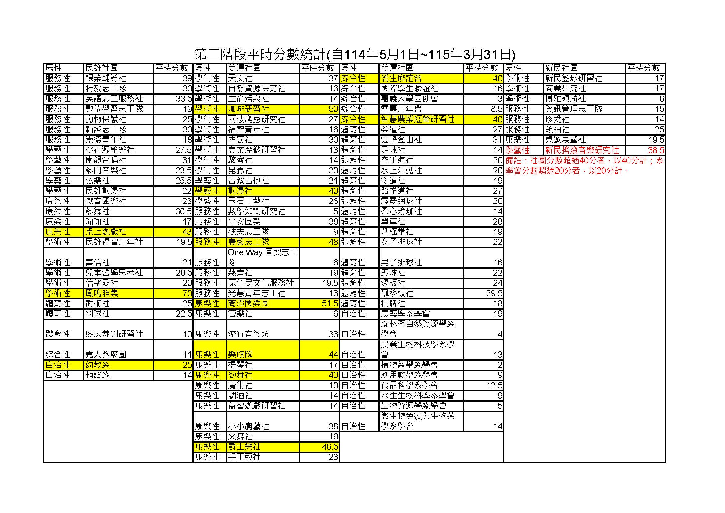 | 2026/04/09 | 115年度學生社團評鑑平時成績第二階段結算結果(114.5.1-115.3.31) | 民雄校區聯合辦公室-學務 | |