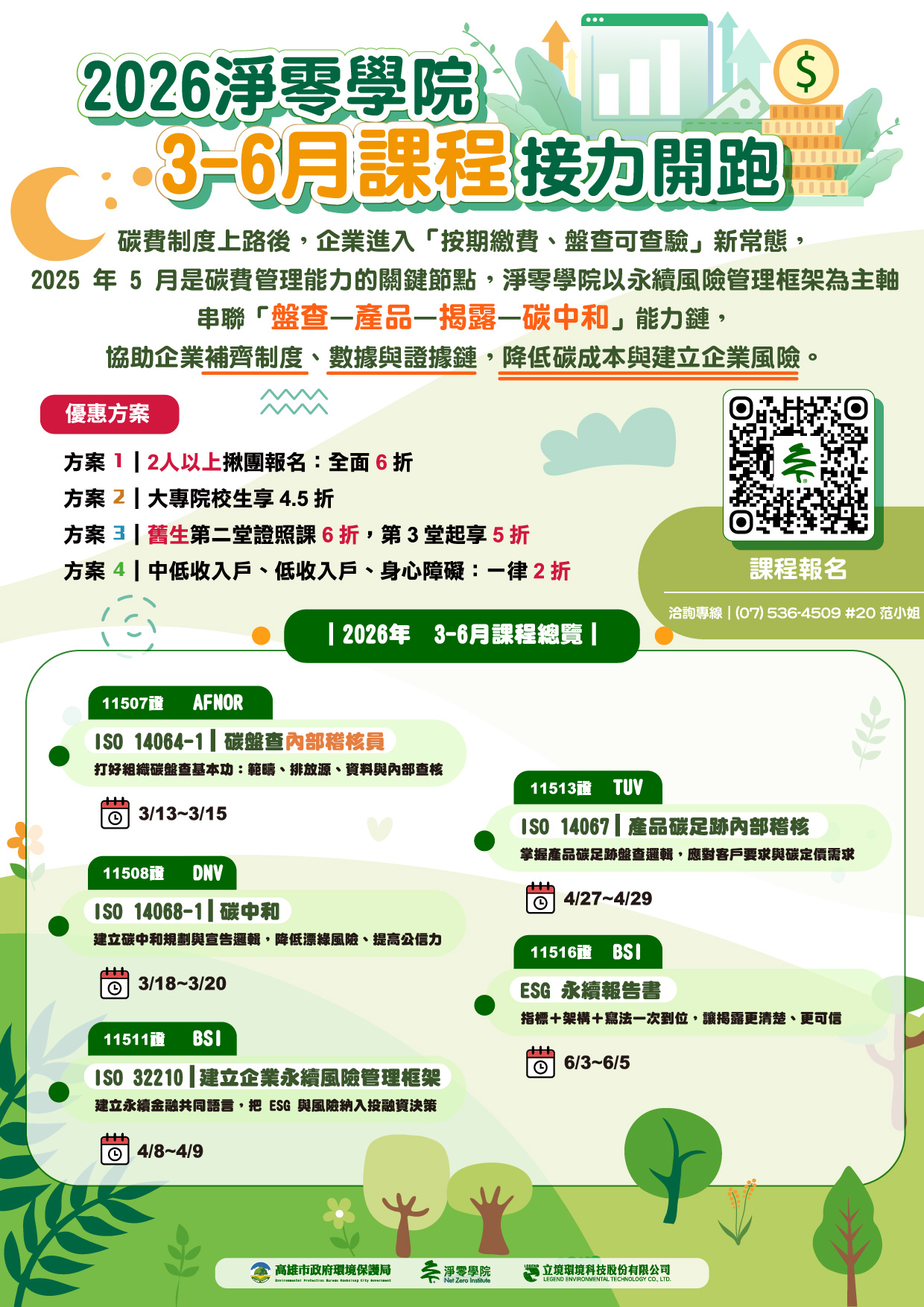 【轉知】高雄市政府環境保護局「淨零學院115年3-6月公開報名課程與優惠方案2.0」